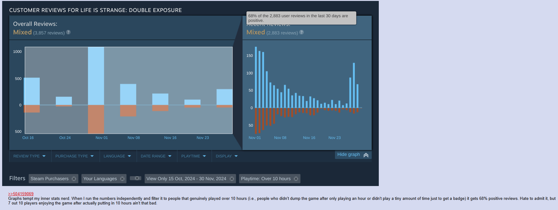 >>563387042It’s pure management incompetence. They mistook Twitter noise for actual market demand.They saw 3,000 negative reviews from multi-accounting cultists and panicked. Instead of building on the 350k-500k people who bought the previous game, they did a desperate pivot to please the crowd who only cares about this game for Tumblr screenshots.Now they have their fake positive reviews, but the sales are non-existent because they alienated the only real audience they had left. Classic SE fumbling the bag.