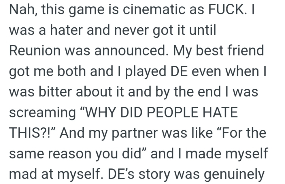 >>563551761>buys DE after playing REI didn't play Reunion, I'm playing through DE to get the context needed to understand everything in Reunion.My bad for not being overly explicit with you idiots.>filtered loreletNo, the game is definitely not as bad as you're making it out to be, flawed as it is.>seethes over AmandaWhatever gave you that impression?Is anything, based on my post you could say I'm seething about Gwen.