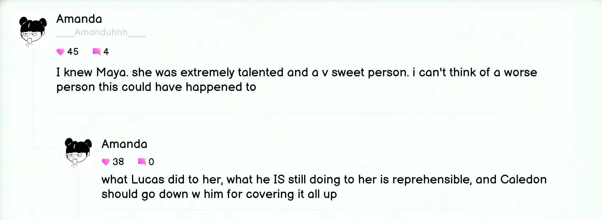 Reminder that Amanda kicked a dude out of the bar for not liking her grilled cheese, but let's Lucas hang out there all fucking day when he's responsible for a girls suicide