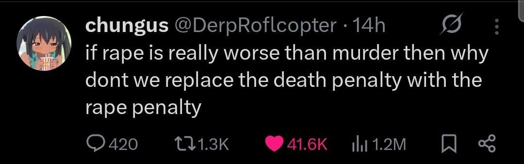 he would be spitting if people actually thought that, who the fuck would rather be killed than be raped? if you get killed you can just be raped after anyway