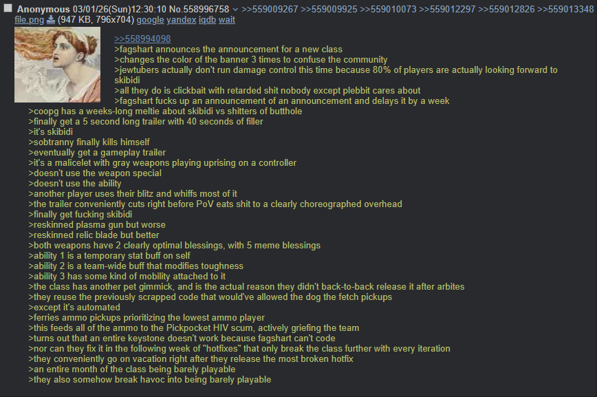 >>563007782>It's like this is all lost tech and all the devs at fatshark have been replaced by somalian niggers.This has been the story of hundreds of video game companies at this point. People treat a company name as a mark of quality when the employees there change - not even get fired, people just sometimes change jobs because of unrelated reasons, and a loss of one competent programmer can utterly change what is and isn't possible anymore. It's enteriely possible Fatshark is a shadow of former self with people gone to greener pastures at Narrowhead or simply laid off because half the stuff is now outsourced to Indians and Chinese(the fucking shop).It's actually weird video games industry isn't more like any other artistic expression industry with how people attach meaning to names of movie directors or actors or musicians and so on. It used to actually sort of happen in 90s (Sid Meier) but the only guy that it still does is I think Kojima. People unironically pay more attention to soundtrack composers like Kyd.
