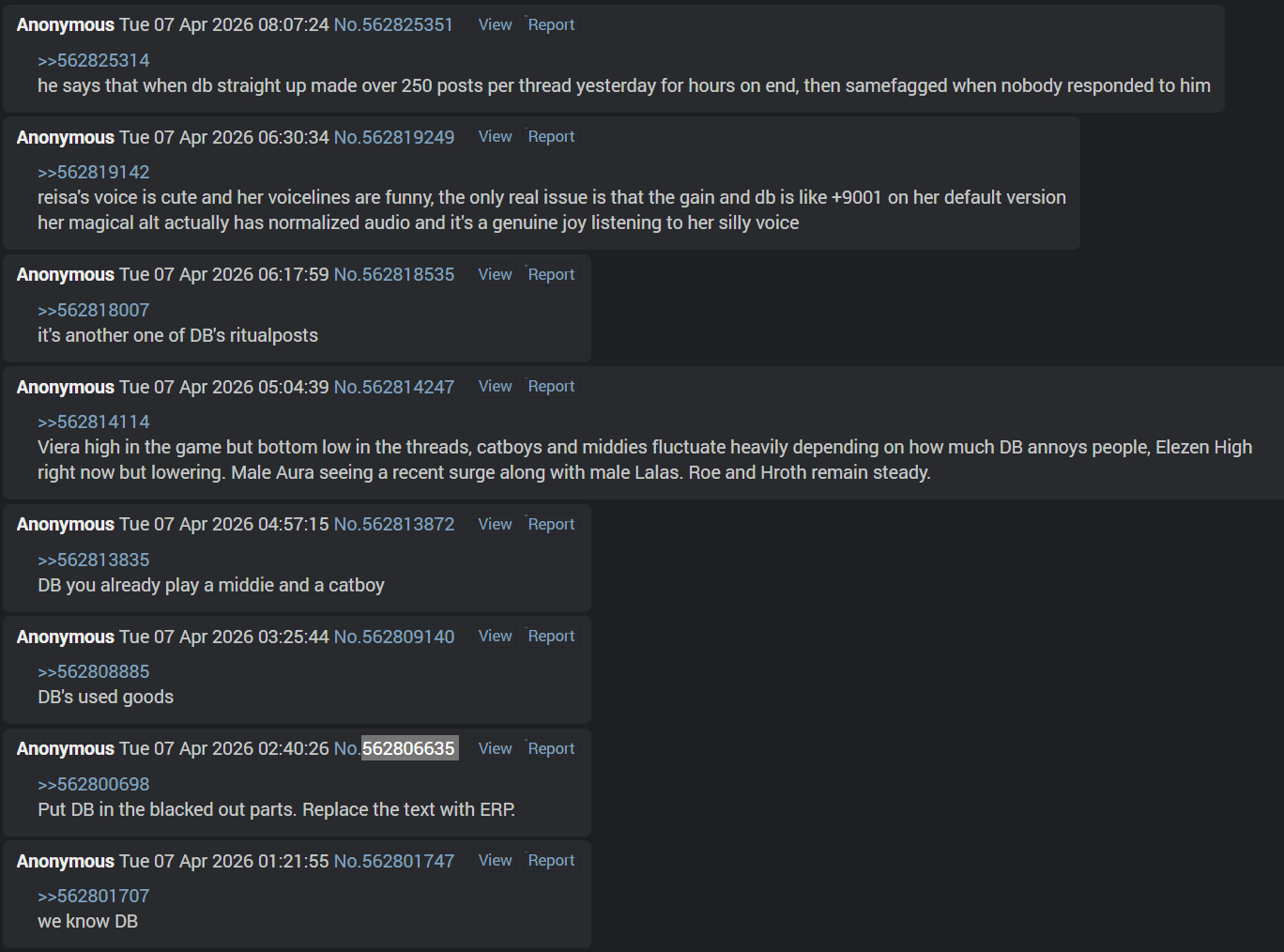 >>562833617>LyingYou've made multiple alts on dead worlds to stalk femroe posters in the past.