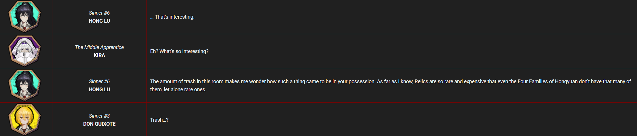 They fucked up by making kindness be hong lu's central theme when it wasn't before. It should have been a secondary theme. I'd have liked him to retain more of the frivolous jokes nihilist aspect instead of just saving that for his ids.