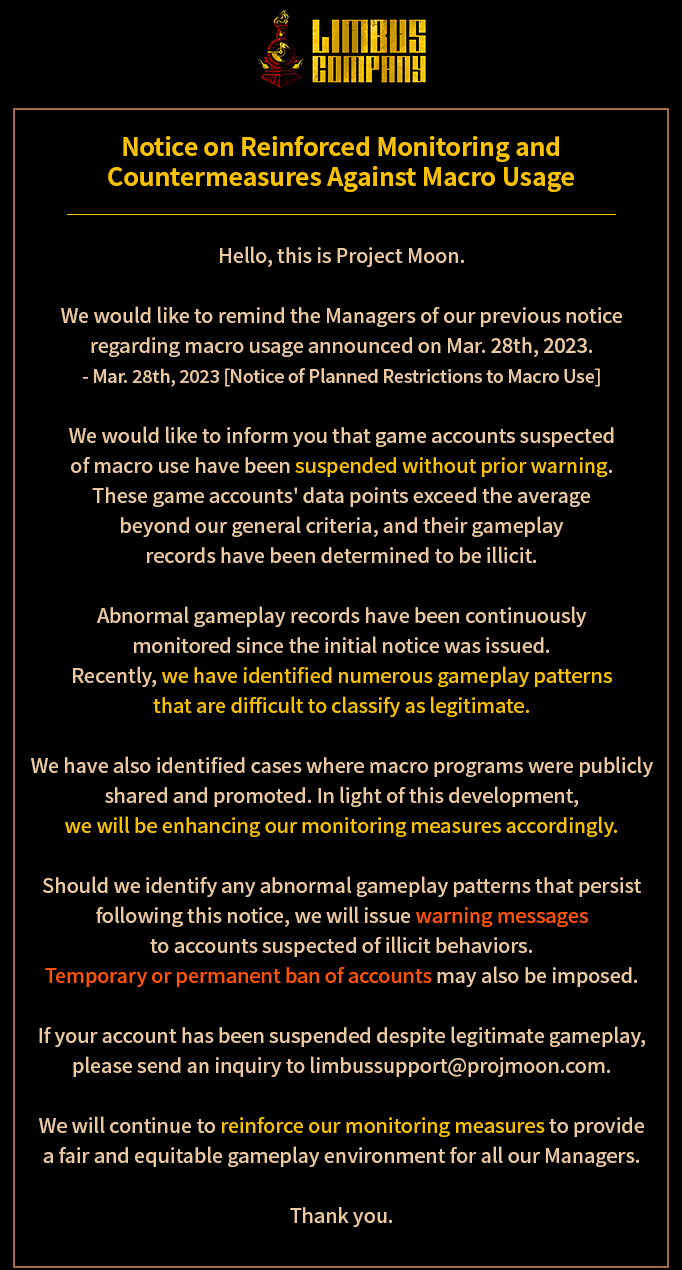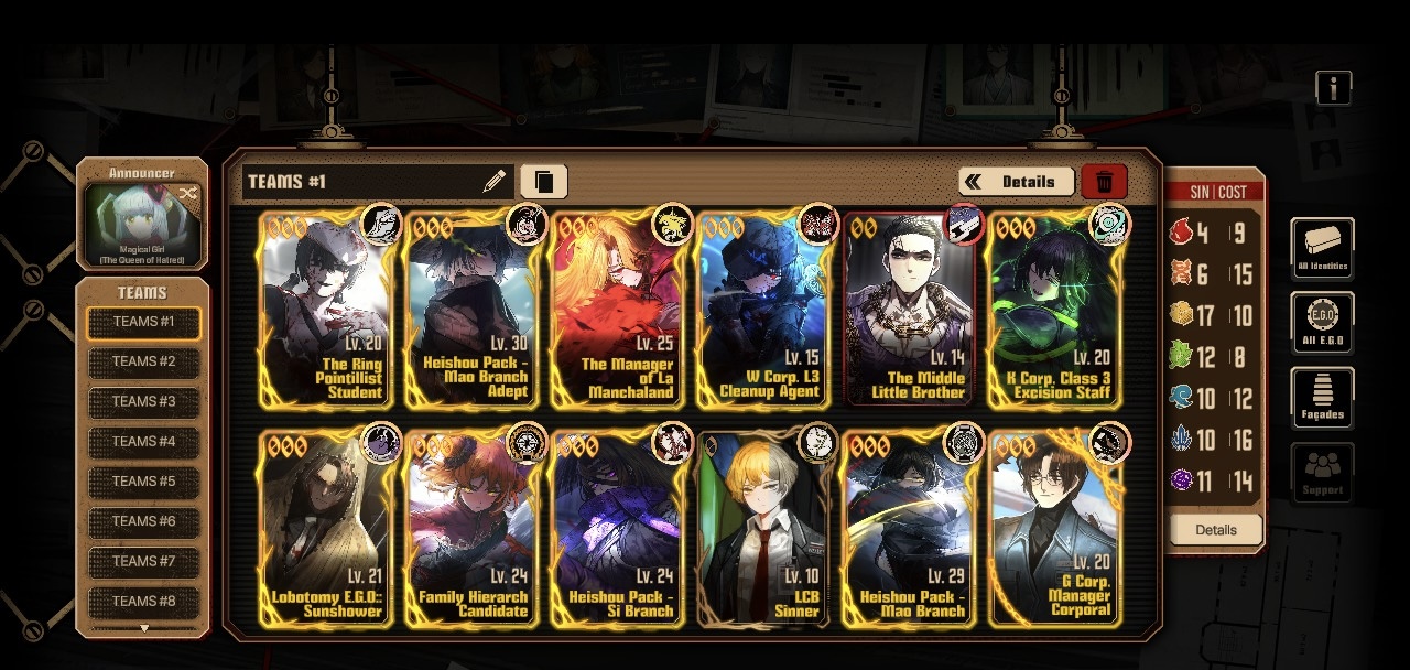 Previous thread: >>562816421Season 7 - Kumo no Ito2025.12.31 — Mirror Dungeon #7 - Mirror of Names and Spiders2026.02.19 —Refraction Railway Line 5 - Merry Go Round2025.02.20 —>Upcoming Events2026.04.16 — 2026.05.14Chapter 9.5 - Twining Threads>Current Events2026.03.19 — 2026.04.16Chapter 7.5 - LCB Regular Check-up BokGak>Current Extractions2026.04.02 — 2026.04.16[000] The House of Spiders: The Ring Nursefather Hong Lu[000] The House of Spiders: The Ring Apprentice Faust2026.03.19 — 2026.04.16[000] LCE E.G.O:: AEED Gregor[HE] Ardor Blossom Star Faust2026.04.02 — 2026.04.16Target Extraction: [ Yi Sang ]FAQs! This game is directly tied to the setting of Project Moon's previous games, Lobotomy Corporation and Library of Ruina, and is set after both. Expect spoilers for those games in this thread.! The tutorial is important.>Download linksAppStore: https://apps.apple.com/app/limbus-company/id6444112366Google Play: https://play.google.com/store/apps/details?id=com.ProjectMoon.LimbusCompanySteam: https://store.steampowered.com/app/1973530/Limbus_Company/>Other linksOfficial twitter: https://twitter.com/limbuscompany_bOfficial youtube: https://www.youtube.com/@ProjectMoonOfficialOfficial site: https://limbuscompany.global>Required readinghttps://mega.nz/folder/xosDkZ5Z#Wt4JpUt5Bb2XG77pxuuXpw>For all your EGO and Sinner info needshttps://limbus.kusoge.xyz/https://gll-fun.com/en/>Useful resources and a general guidehttps://rentry.org/lcg_resourceshttps://rentry.org/lcbguidehttps://rentry.org/LCB_optimal_grind_guidehttps://lcb-days-since-last-id.carrd.co/https://lcb-days-since-last-ego.carrd.co/>Countdownhttps://lcbcountdown.carrd.co/