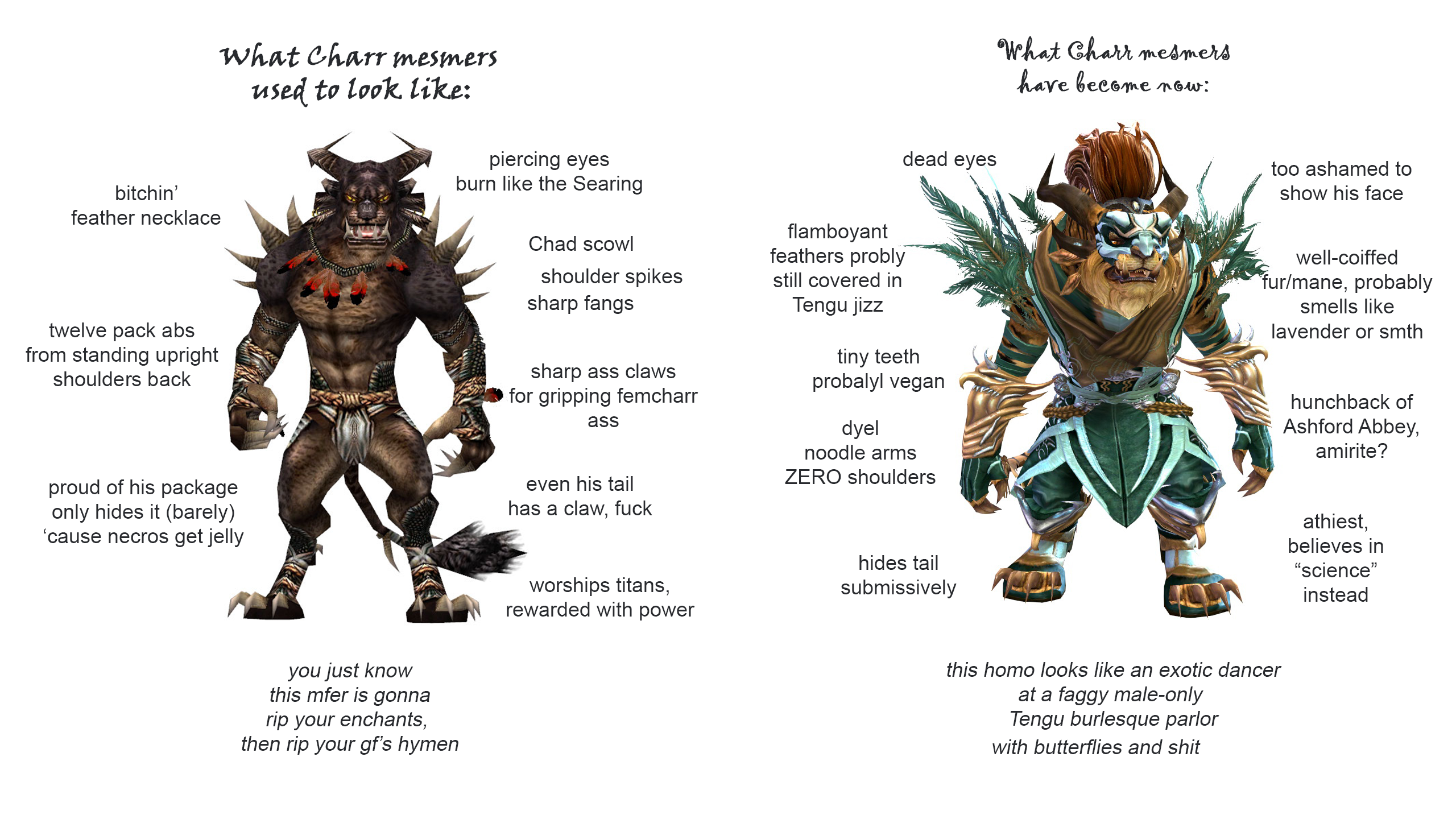 >>562879361That climax that said that the gods were still around, they just weren't involving themselves in worldly affairs?Which again is a marked difference from saying they're gone entirely, but I don't know why I'm even arguing over shit that happened 10 years ago. The plot still sucks and hasn't not sucked since HoT.Also all mesmers are trannies until proven otherwise. Lyssa truly is the worst.