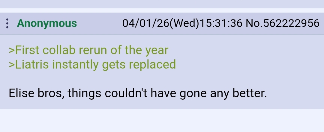 >>562858040>It basically took me 9 months until I had enough investment in Lia/Rubia since so many of their costumes need +3 for SP reduction and then I still had to wait 3 more months for Loen Rerun to finally get a decent team 2I should add that the 1pick now reruns every 3 months as part of their .1/4th anni approach which helps a lot, but yeah. Fire is a hard element to get into as a newglutti, same for Wind pre-Tyr era. >>562859796Decent chance how? Helena already exists and giving Liberta such a costume not only invalidates her but also Granadair in one shot.>>562862337Darian is already confirmed to get a special pool skin this summer, that should rule her out for getting a costume. Unless she gets 2 summer costumes in one setting but that would be the dumbest move ever.