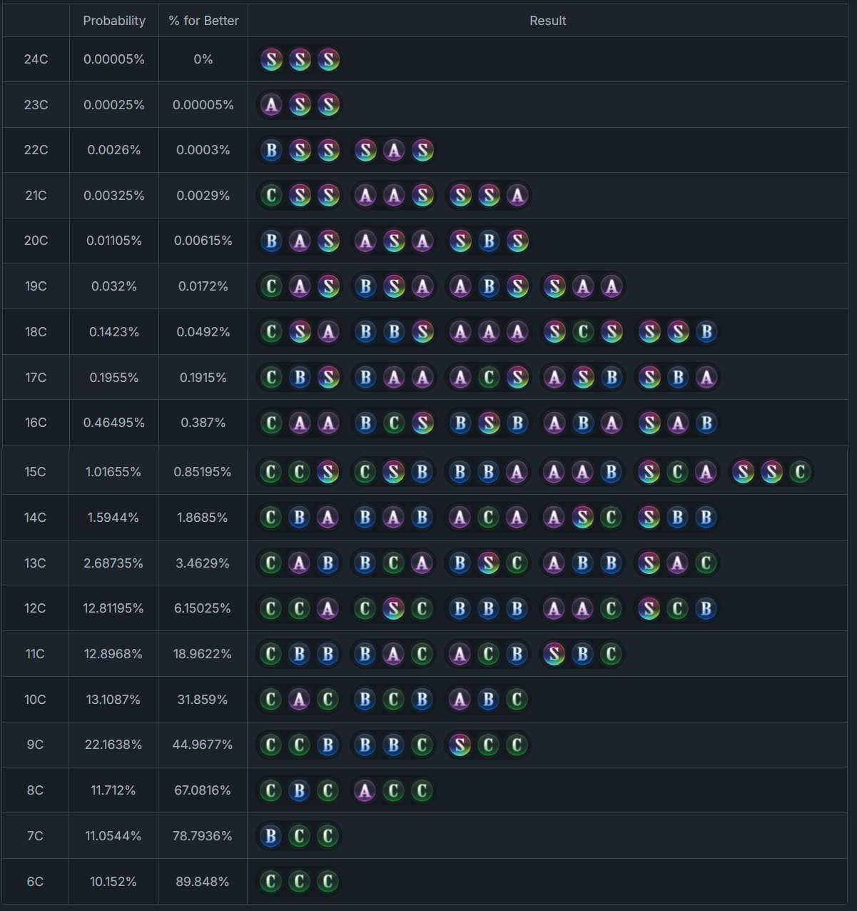 >>562868159BSS is the last one you can get somewhat easily. After that it can literally take years as I am an ancient glutti and I just recently got my first ASS. SSS is lottery tier.