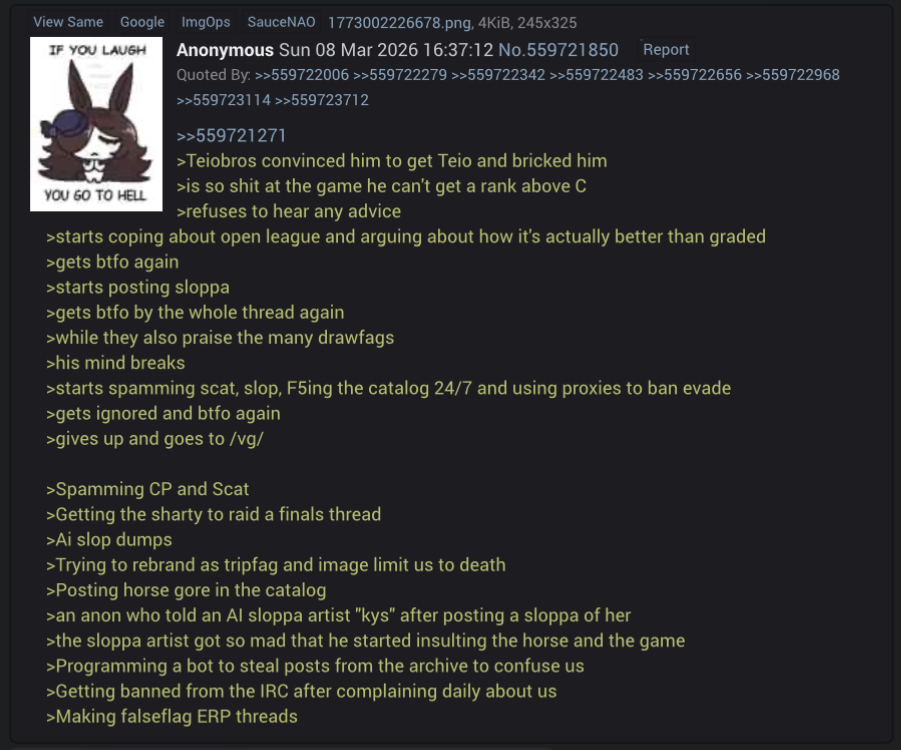 >>562860245>>562860418Oh I see, this, the first 2 parts are not the same person, I don't know why they were merged together, though Teiofags on /v/ were known for trying to brick newfags into using their starter selector on her. The part about sloppa and scat and "the bot" is, the same guy, the scatjeet who now lives with you guys and has apparently adapted pretty well to /uma/ ans has become a civilised member of your community by posting goonslop