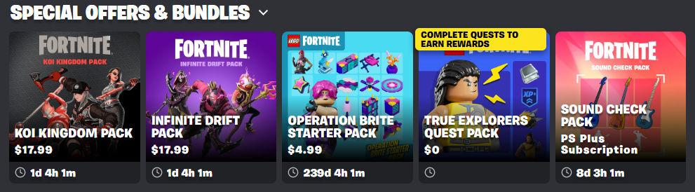 Koi Kingdom and Infinite Drift packs leave tomorrow on shop reset, as of right now there's no way to know what replaces them, but the Rogue Agent pack was supposed to at least return last update and so far nothingpacks are also 50% off