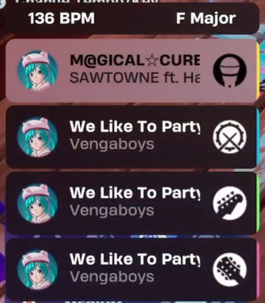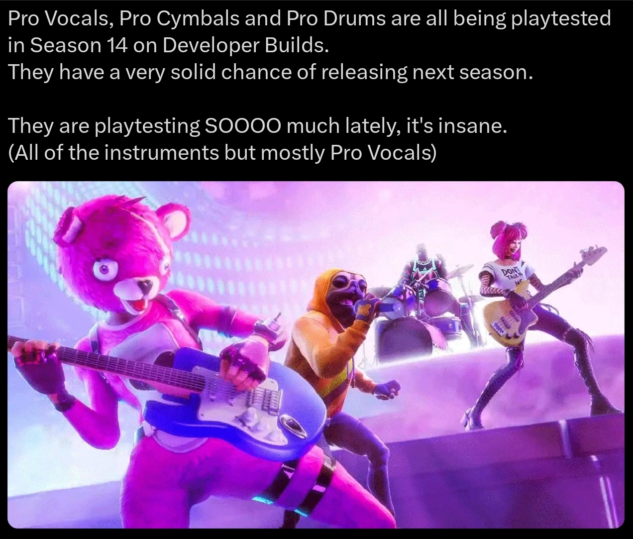 >>562865579he didn't straight up confirm it but he implied festival with devs would have something for the HSC fans, but now that i remember two anons also posted some music tracks would get jam track versions so maybe he was just teasing daraku's song being playable in festival>>562865670i don't even have crew and my best date is in 1 month but i would still buy the festival pass with vbucks even if it wasn't the best move>>562865798i would also take any vocalid especially luka but we all know teto practically ate the competition but miku, it's a miracle neru is somehow relevant but still not as big as the other two, real artists aren't just that interesting when they already got the big ones and the other big ones are dead