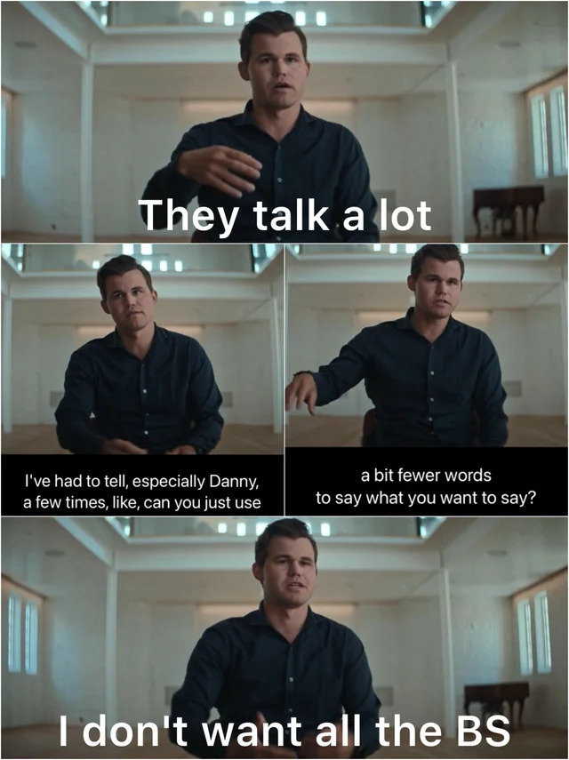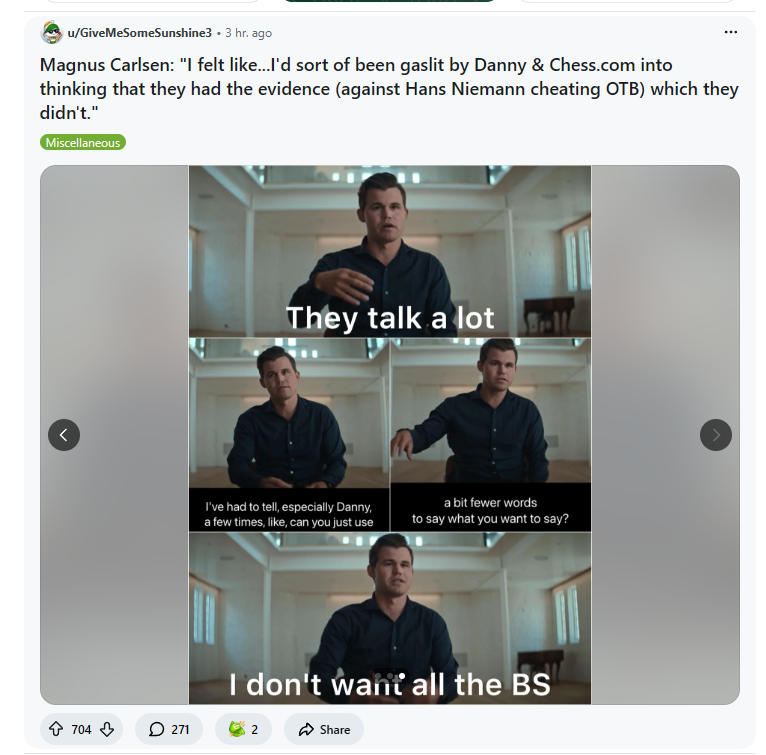 >[Magnus Carlsen] can't even look me in the eye. He's too scared to even come near me. It was traumatic for him. If he had to look me in the eye and shake my hand, he'd collapse on the ground and have a nervous breakdown*feels the aura*