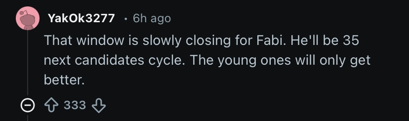 >*extremely small autistic voice*“Um, yeah, I think I did everything I could in this tõrenament. It didn’t go my way, but, you know, that’s not too unexpected, for me, anyway. Now at least I can go home, watch some anime and maybe get my cock out a little bit.”—real Fabi post-Candidates 2026 interview btw