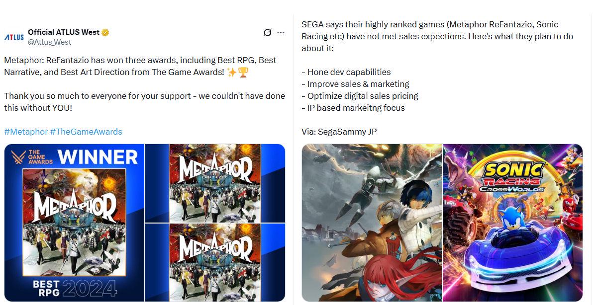 >>563154119What Sega actually talked about recently is covered by this article, since 2020 they've talked often about trying to boost sales by improving critical review scores to what they consider to be high (in the 80s). This was a big thing when they were marketing Sonic Frontiers, and while it scored well under what they wanted Sonic Frontiers sold very well anyway. Since then, Sega was the best reviewed publisher multiple years in a row, and they're at the point where they're now acknowledging that review scores don't seem to be having much of an impact on what does well and what doesn't. Especially in light of the poor performance of the new Sonic spinoff which was their best rated Sonic game since Mania. This is like the 10th time Sega said they want to change their marketing practices in the last year also. https://www.videogameschronicle.com/news/sega-says-strong-reviews-for-its-recent-games-isnt-yet-translating-to-better-sales/For Atlus I don't think the issue is sinking too much money into a project, it's more likely the opposite both in dev and in marketing, and you can use Metaphor as an example of this too. In the interview collection from during Metaphor's development Hashino bitched constantly about the budget constraints they were under (which was from 2019-2024). Then when it came time to market everything went into the evergreen Persona marketing for the P3 remake, didn't bother translating any of the daily videos, did a single content creator event in the US, had no plans for any of the metaphor events to come west. What actually counted in the end was putting out a demo that got in front of all the right people. And this was for something they had what they considered high expectations for from the outset, not some side project to pad out a barren pipeline like Raidou HD.
