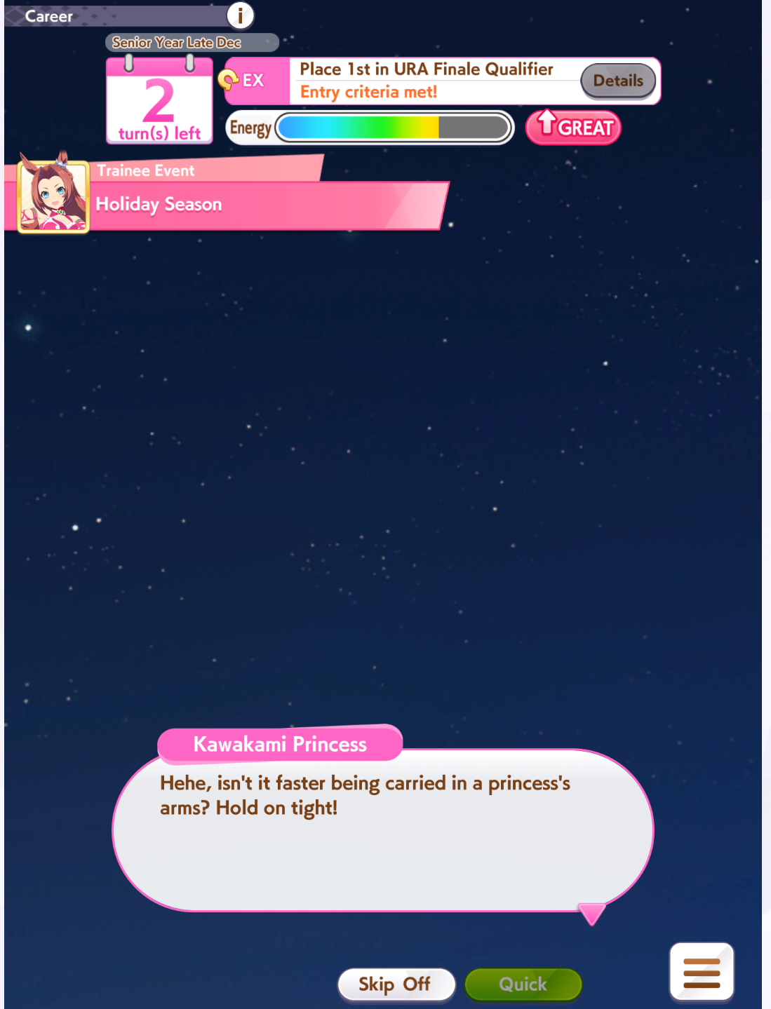 what the fucki do a quick shits and giggles ura finale run to get the last 50k fans i need for the falco event, and i got a scenario record, and pretty much every training turn had 2 rainbows