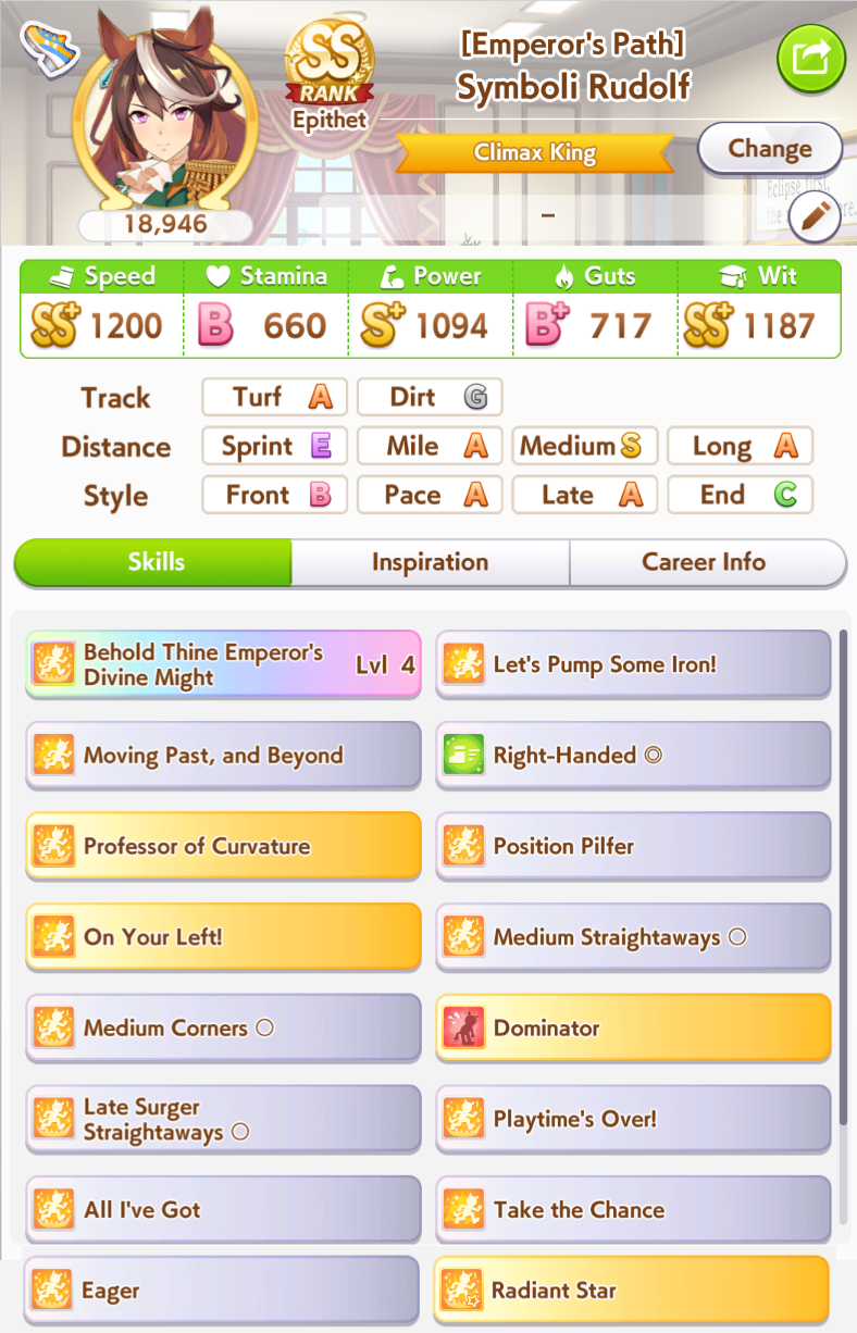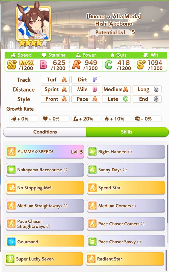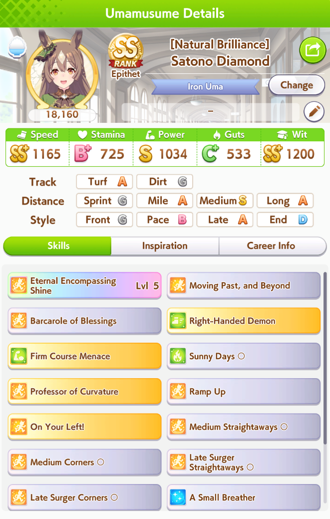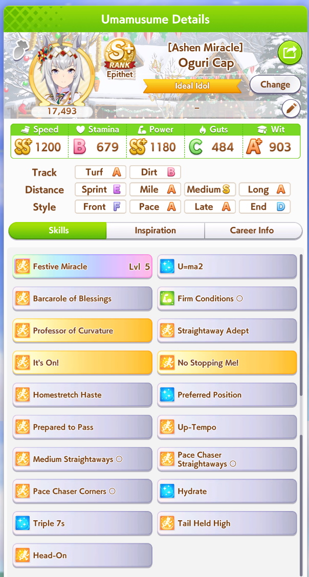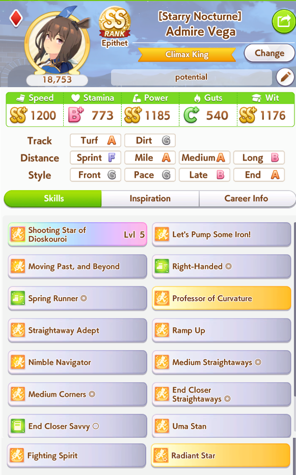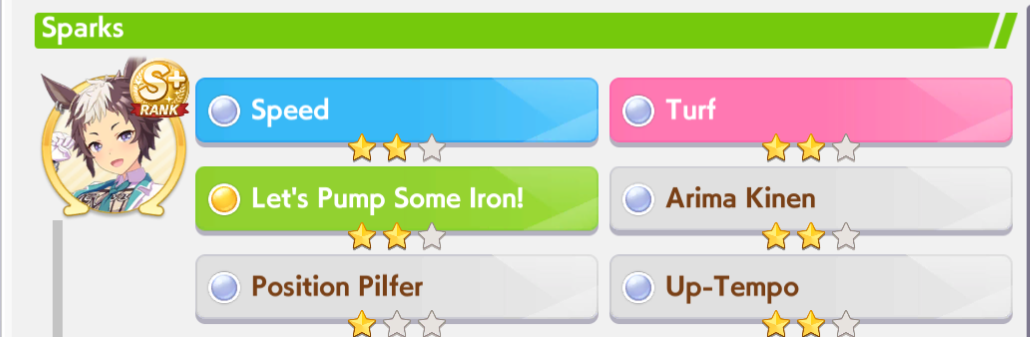 >>562902652>>562902750At 545 currently +400 from career bonus right? >>562902679Stamina to Spare, Hydrate, U=Ma2, 777I know U=Ma2 fails if she's in first so that's part of the problem but hydrate seems to miss a ton.