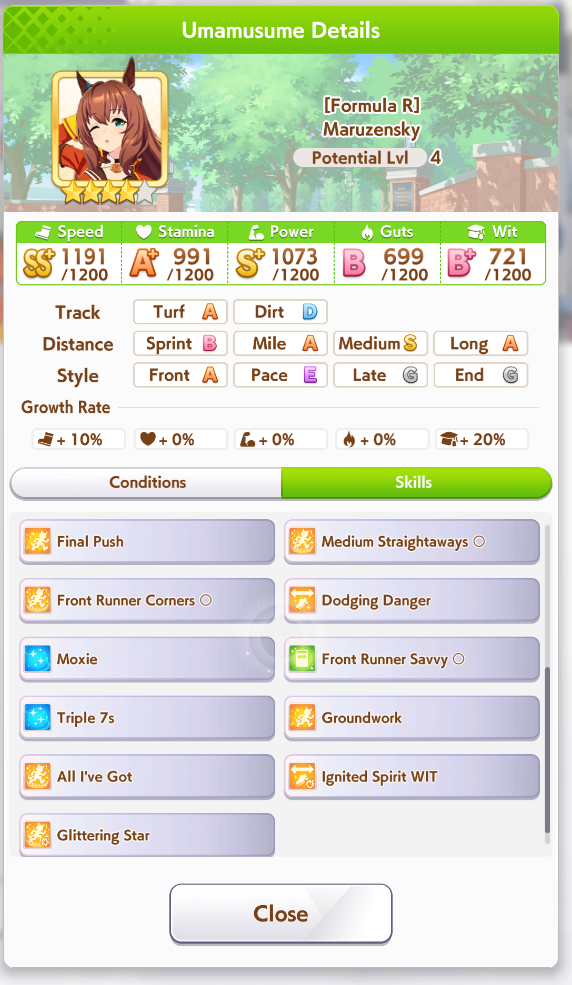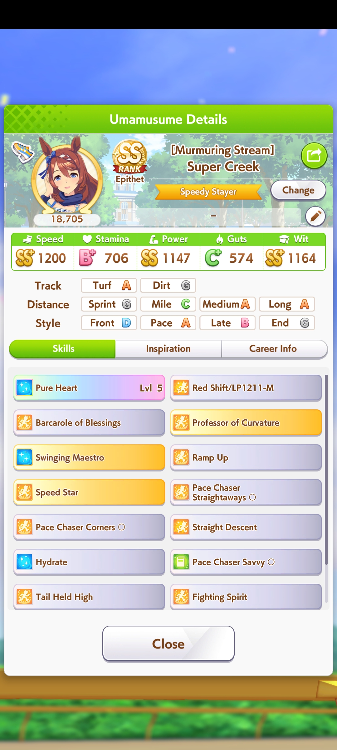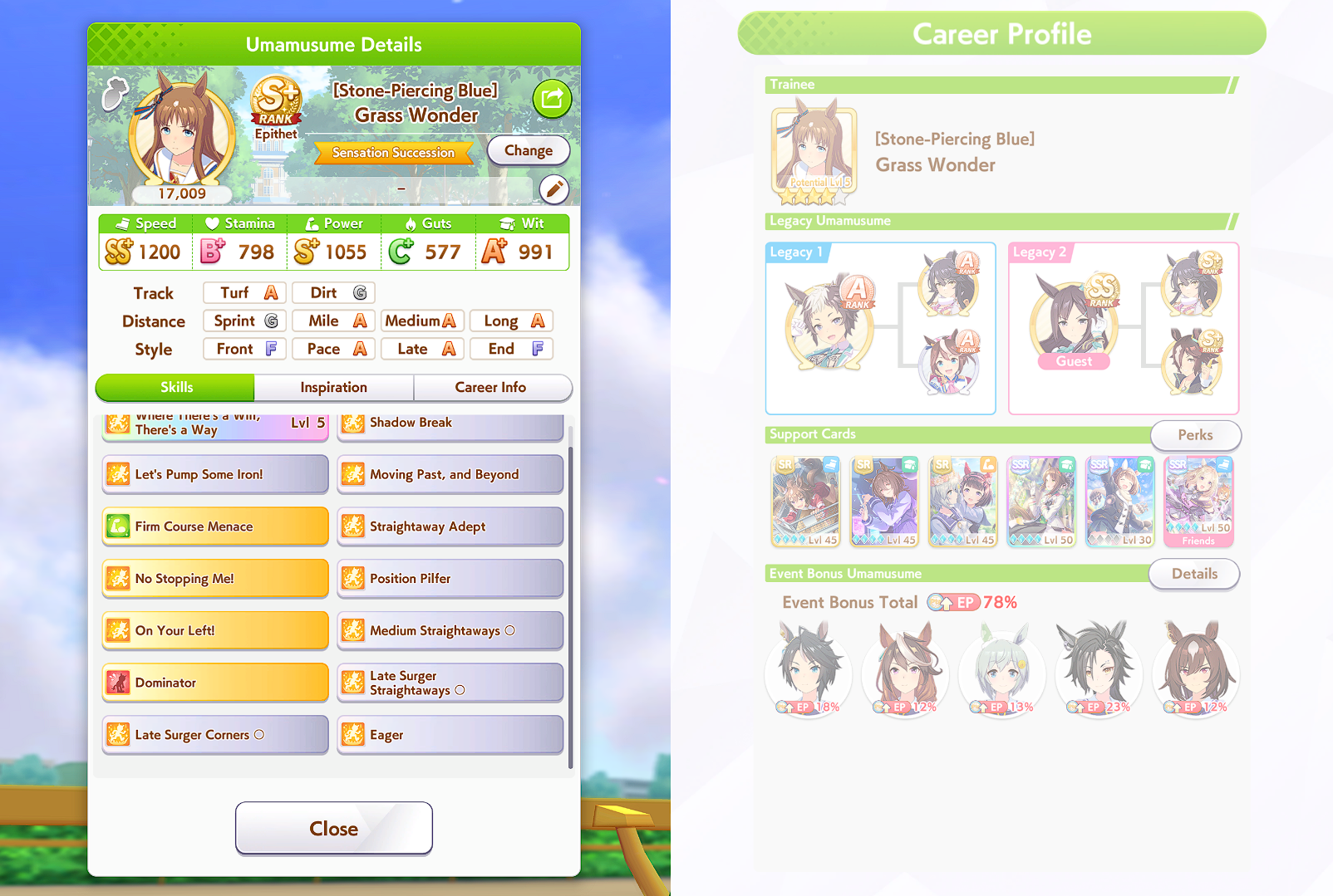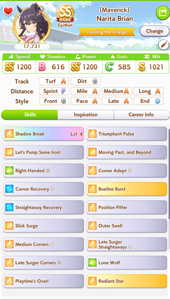 >>562902652>>562902750At 545 currently +400 from career bonus right? >>562902679Stamina to Spare, Hydrate, U=Ma2, 777I know U=Ma2 fails if she's in first so that's part of the problem but hydrate seems to miss a ton.