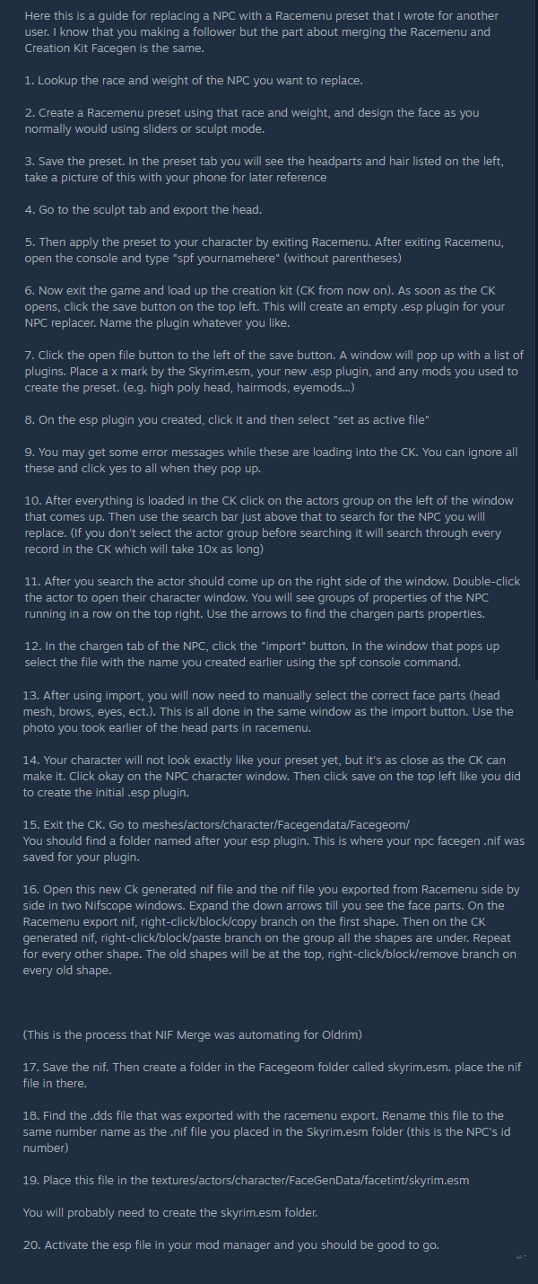 >>562907523>>562908052It's been a while since I modded anything so a better method has probably been figured out, but you used to not be able to just edit records in xEdit to change an NPC's 3d geometry, you would have to actually go into the CK, import the face mesh, make sure the parts match up, then after that you might've had to do some nifskope work. You have to do all this because of facegen fuckery iircPic rel was what I followed.