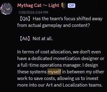 I wonder if Morimens would have been better as a multi-part indie title instead of a gacha. In the recent interview, Light said that the "original producer" decided that Morimens would be a gacha from the very beginning. Who knows how different things would have been if the game started as simply an indie sts-like (maybe with an early access phase). It might've succeeded and made BIAV a well-known studio, it might've crashed and burned due to lack of funding compared to the standard gacha model, or it might've faded into obscurity after an overall decent Steam release. From what I've seen from BIAV over the past year of playing, and their inexperience with paid packages and monetization, they might have been much better suited to developing a standalone title. As much as I would have liked for Morimens to have been something fully complete like Chrono Arc, I'm just glad that the devs are generous and are aware of the negatives of the gacha/mobile game model they've been strapped with. It can be difficult to remain patient with them at times, though.