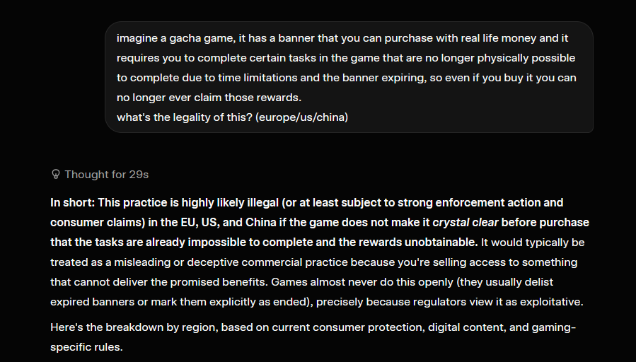 TL;DRalmost certainly would get fined in the EUUS is case by case and hast the loosest laws so it's uncertainchina has the strinctest regulations and this is definitely illegal>Core violation: The National Press and Publication Administration (NPPA) heavily regulates online games. Rules (including 2023–2024 drafts now in force or near-final) ban reward mechanics that encourage "irrational consumption" or overspending. Selling a banner where rewards cannot be earned due to expired tasks would be seen as misleading consumers about what they're buying — violating transparency and anti-addiction requirements.