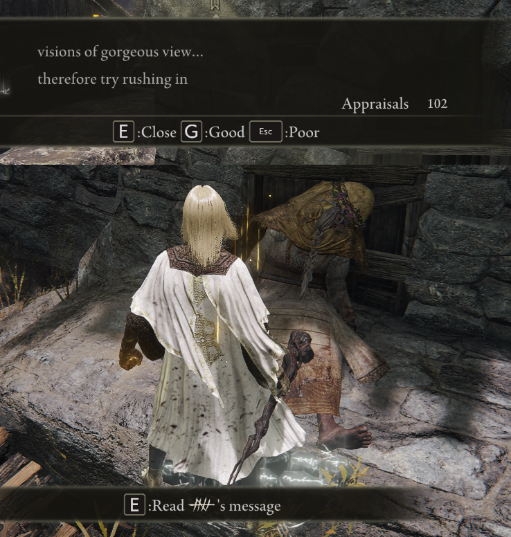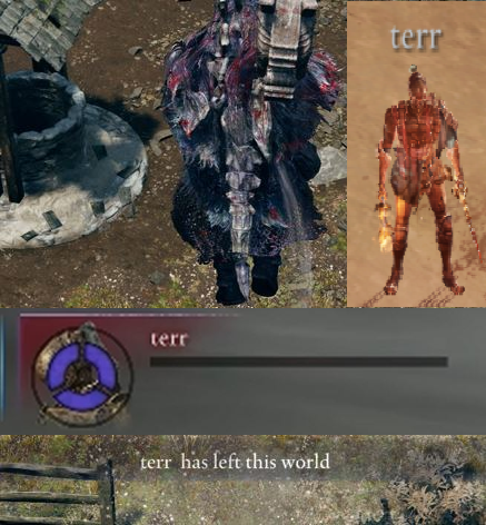 >"You fucking piece of shit tarnished. What the fuck is your problem? You feed me death root then kill me without saying a fucking word? I swear to Marika you are the biggest piece of shit."