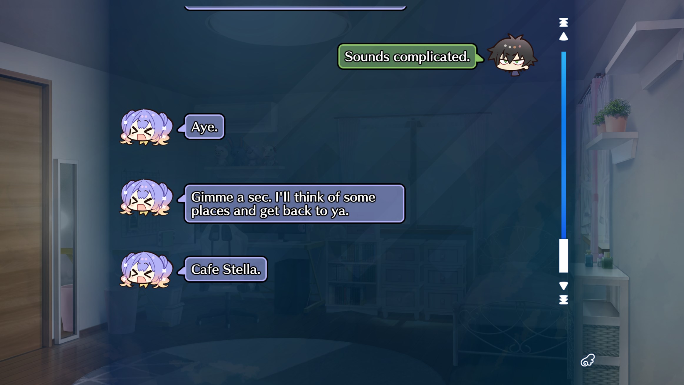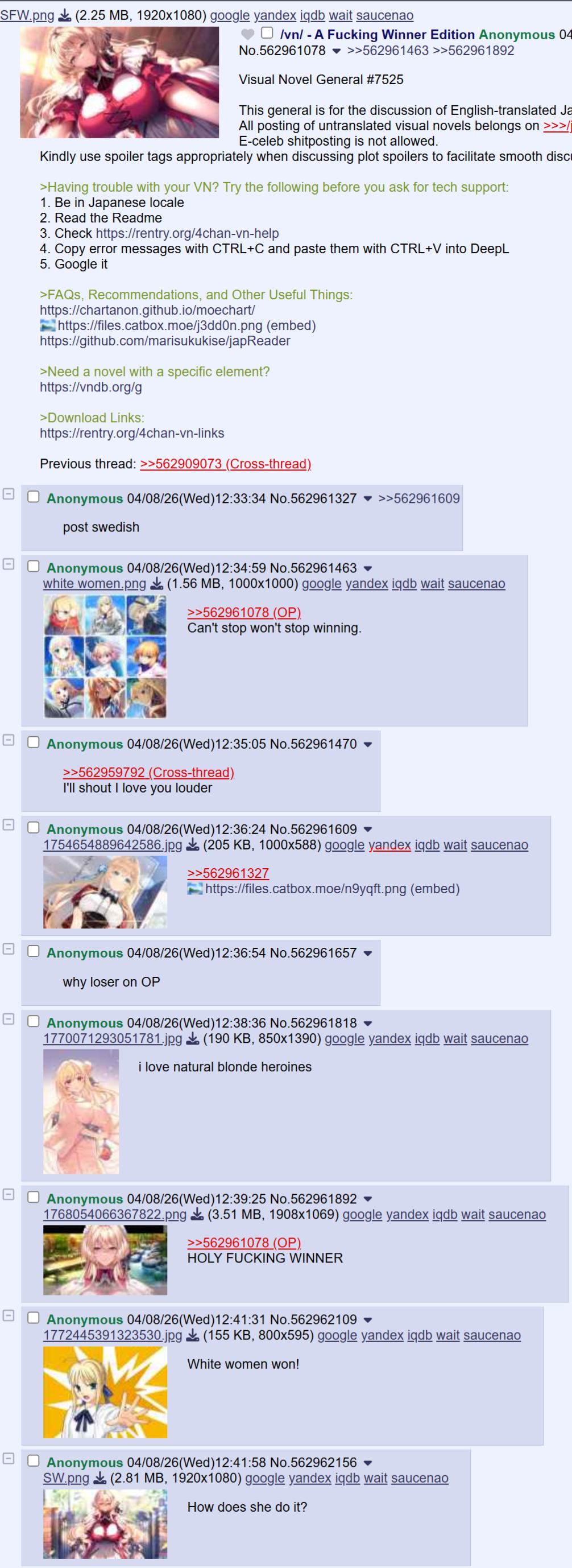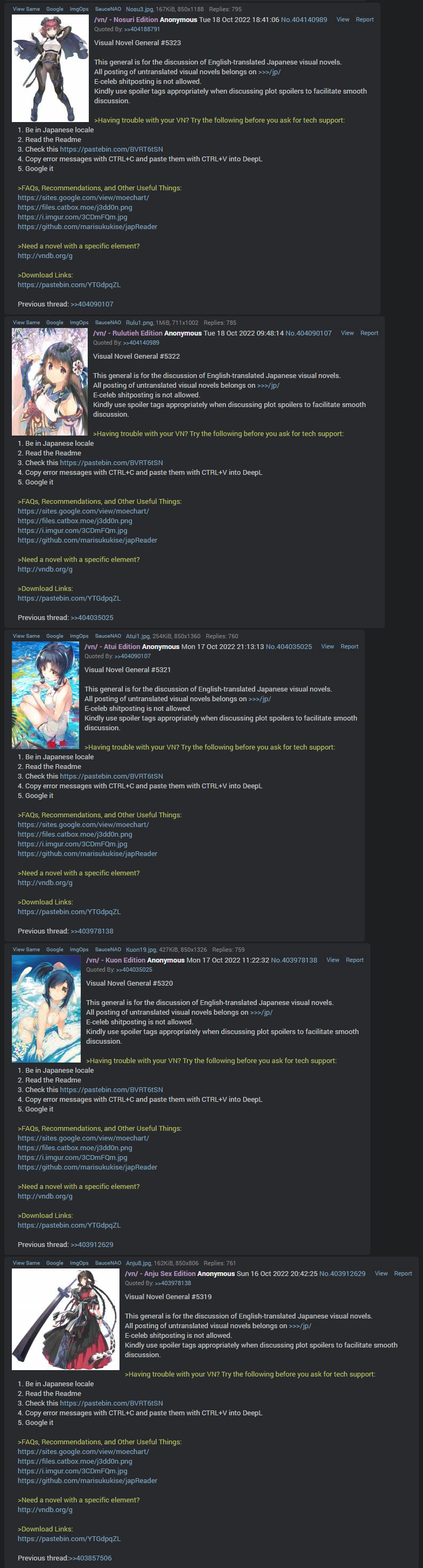 Visual Novel General #7524This general is for the discussion of English-translated Japanese visual novels.All posting of untranslated visual novels belongs on >>>/jp/E-celeb shitposting is not allowed.Kindly use spoiler tags appropriately when discussing plot spoilers to facilitate smooth discussion.>Having trouble with your VN? Try the following before you ask for tech support:1. Be in Japanese locale2. Read the Readme3. Check https://rentry.org/4chan-vn-help4. Copy error messages with CTRL+C and paste them with CTRL+V into DeepL5. Google it>FAQs, Recommendations, and Other Useful Things:https://chartanon.github.io/moechart/https://files.catbox.moe/j3dd0n.pnghttps://github.com/marisukukise/japReader>Need a novel with a specific element?https://vndb.org/g>Download Links:https://rentry.org/4chan-vn-linksPrevious thread: >>562860832