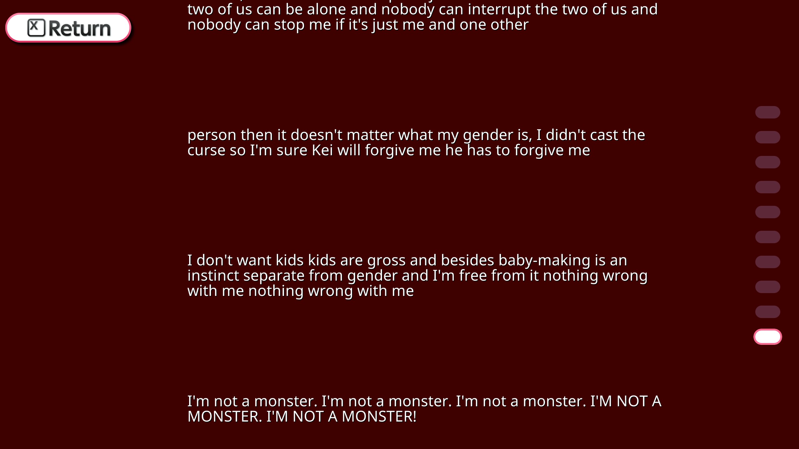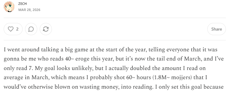 H scenes feel very abstract to me because I've never even done basic sexual things irl I can't even imagine how it feels to finger pussy or lick females nippes or have your dick sucked. I try my best to approximate the feel and texture but it has no sense of reality to it because none of this imagination is anchored in my real experiences.
