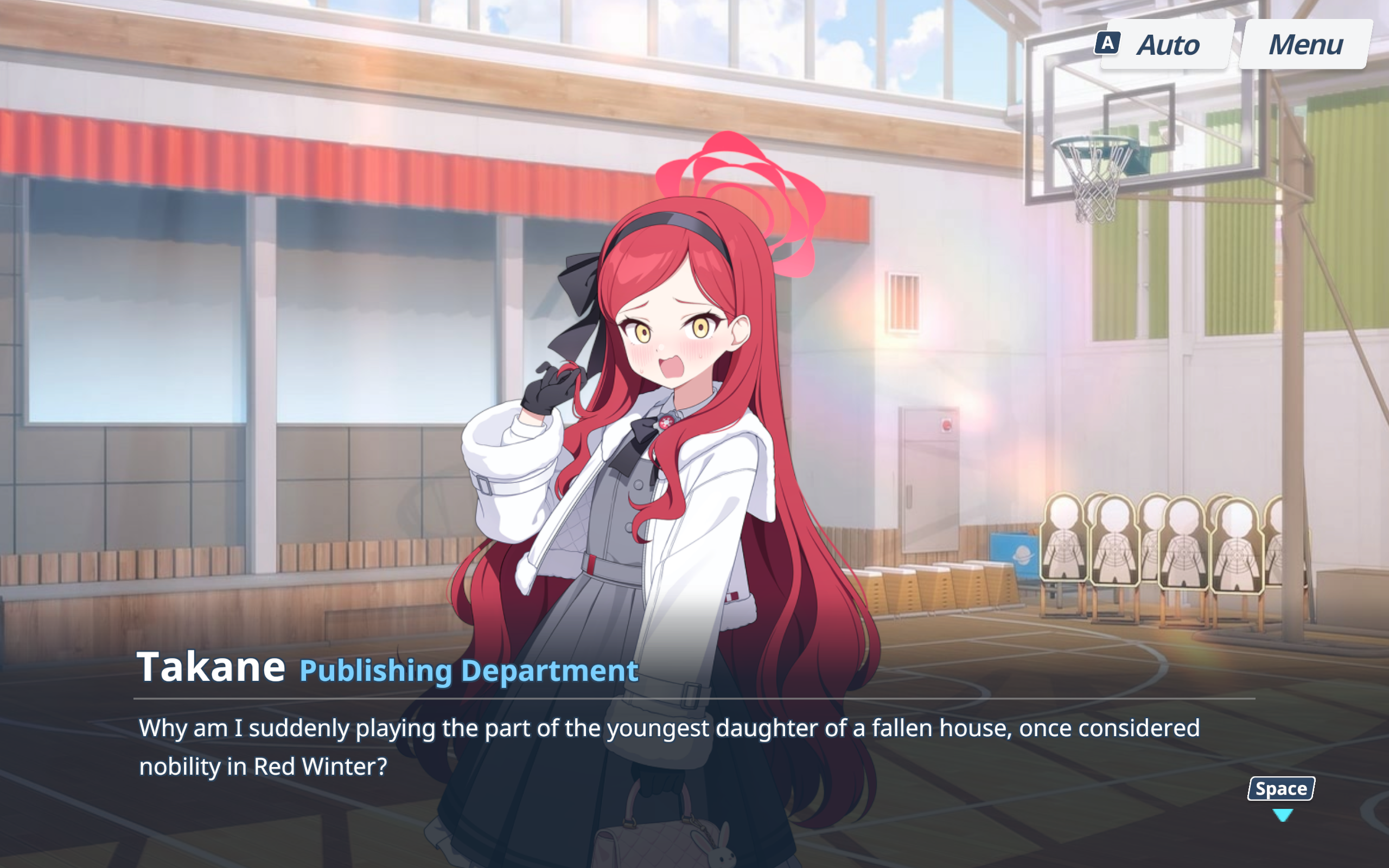 >It would seem that her character is an elaborated homage to Grand Duchess Anastasia Nikolaevna. Anastasia was known as one of fourth and youngest daughter of the last Tsar of the Russian Empire, Nicholas II. This is due to the following factors:>They both share the same birthday (June 18th) and hobbies (reading and photography), while Takane's additional love for watching ice hockey is shared with Nicholas II.>The name of her firearm "Schwipsig" is a nickname that was given to Anastasia by her father.>In the event "Revival of Winter Sky Literature", Yakumo fabricates a backstory for Takane, one where she was the last remnant of a once wealthy family that was forcibly expelled from Red Winter and had to go into hiding to survive. This backstory relates to the myth of Anastasia's alleged survival during her family's execution at the hands of Bolshevik revolutionaries under the orders of the Ural Soviet in July 1918 during the Russian Civil War.Some people might miss a few of the references