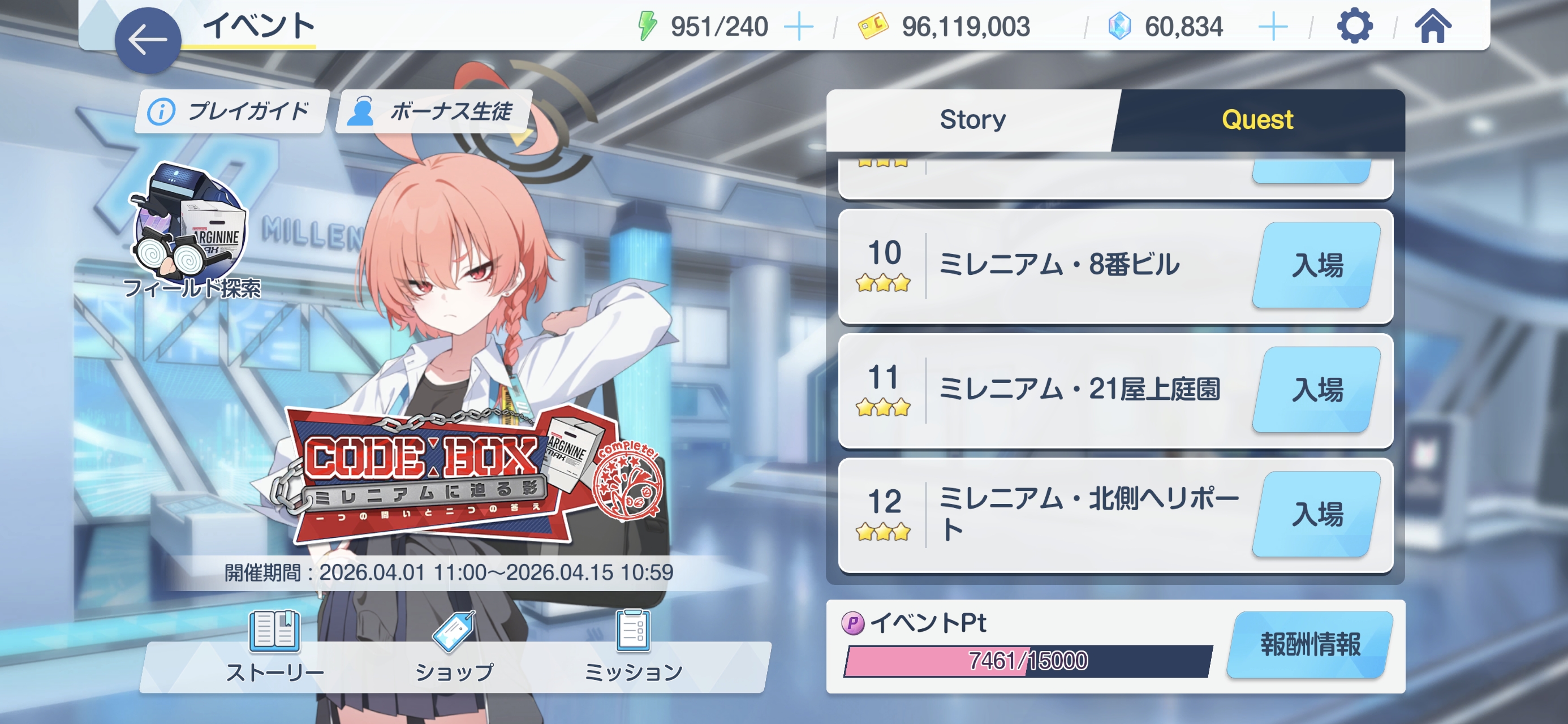 Previous Thread: >>562889053>Guides, Resources and useful links:https://rentry.org/bagguides>/bag/Circles/Clubs/Friends:https://rentry.org/holdingthebag>4koma, Manga, Side Content, PVs & Shortshttps://rentry.org/bacontent>>(JP) – JST>Banners:>4/1 After Maint – 4/15 10:59Akane (School)Seia (Limited)Asuna (School – Limited)Karin (School – Welfare)Toki (Bunny)>News:Patch notes: https://bluearchive.jp/news/newsJump/645>Events:Code: BOX - The Shadow Approaching Millennium – 4/1 After Maint – 4/15 10:59Balancing Schale's Books with the General Student Council – 4/15 11:00 – 4/21 10:59>Content:Joint Firing Drill (Breakthrough) – 4/1 After Maint – 4/8 3:59Grand Assault: Perorodzilla (Field – Torment w/Heavy & Special Armor) – 4/8 11:00 – 4/15 3:59Limit Break Assault: Tiphareth (Indoor – w/Elastic Armor) – 3/19 11:00 – 4/21 3:592x Lesson/Scrimmage – 4/1 4:00 – 4/8 3:592x Hard – 4/8/ 4:00 – 4/15 3:592x Commissions/Bounty – 4/15 4:00 – 4/21 3:59>>(GLOBAL) – UTC>Banners:>4/7 After Maint – 4/21 1:59TakaneYakumoMeru, MomijiMinoriShigure (Hot Spring)Serika (Swimsuit)>News:Patch notes: https://forum.nexon.com/bluearchive-en/board_view?thread=3415801>Events:Winter Sky's Renaissance: Thesis on Cultural Exchange – 4/7 After Maint – 4/21 1:59My Office: https://bluearchive.nexon.com/user/myoffice>Content:Total Assault: Kurokage (Urban) – 4/7 After Maint – 4/13 18:59Joint Firing Drill (Breakthrough) – 4/14 2:00 – 4/20 18:59Limit Break Assault: Chokmah (Field – w/Heavy Armor) – 4/8 2:00 – 4/27 18:592x Bounty – 4/6 19:00 – 4/13 18:592x Account EXP – 4/10 19:00 – 4/12 18:592x Normal/Hard – 4/13 19:00 – 4/20 18:592x Account EXP – 4/17 19:00 – 4/19 18:592x Lesson/Scrimmage – 4/20 19:00 – 4/27 18:592x Bounty – 4/27 19:00 – 5/4 18:59