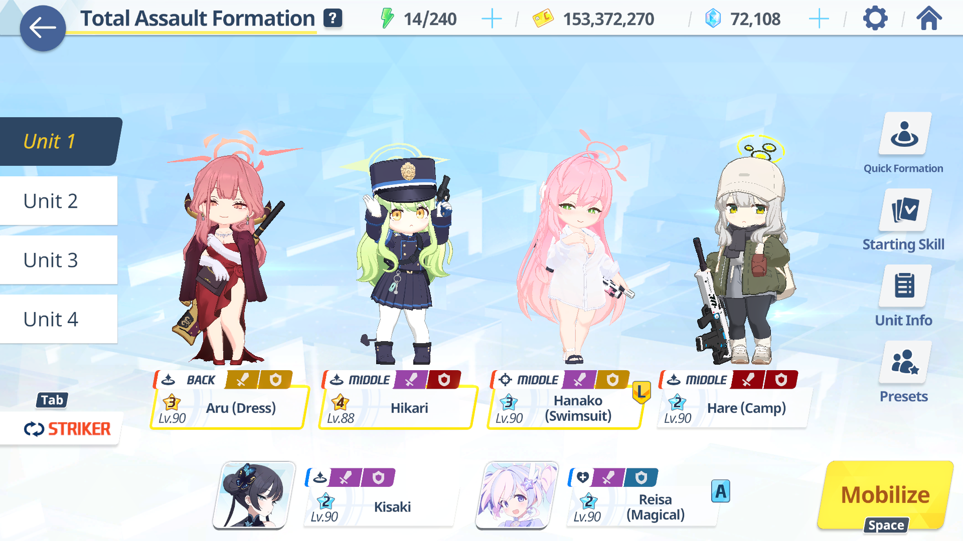 >>562936183I'm using literally that exact team and it's pretty comfortable. You don't even really need to do anything complex in terms of rotation. Just wait for 9-10 cost to put down Reisa then wait go Hikari > dAru > cHaru > Kisaki Hanako x3 and basically just repeat that for the entire fight.