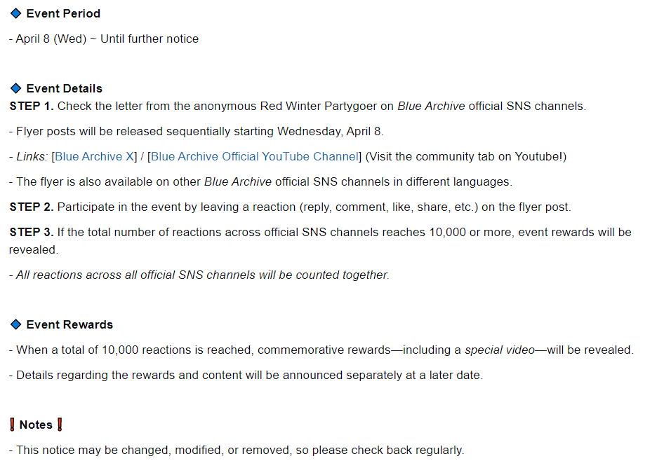 Previous Thread: >>562916109>Guides, Resources and useful links:https://rentry.org/bagguides>/bag/Circles/Clubs/Friends:https://rentry.org/holdingthebag>4koma, Manga, Side Content, PVs & Shortshttps://rentry.org/bacontent>>(JP) – JST>Banners:>4/1 After Maint – 4/15 10:59Akane (School)Seia (Limited)Asuna (School – Limited)Karin (School – Welfare)Toki (Bunny)>News:Patch notes: https://bluearchive.jp/news/newsJump/645>Events:Code: BOX - The Shadow Approaching Millennium – 4/1 After Maint – 4/15 10:59Balancing Schale's Books with the General Student Council – 4/15 11:00 – 4/21 10:59>Content:Joint Firing Drill (Breakthrough) – 4/1 After Maint – 4/8 3:59Grand Assault: Perorodzilla (Field – Torment w/Heavy & Special Armor) – 4/8 11:00 – 4/15 3:59Limit Break Assault: Tiphareth (Indoor – w/Elastic Armor) – 3/19 11:00 – 4/21 3:592x Lesson/Scrimmage – 4/1 4:00 – 4/8 3:592x Hard – 4/8/ 4:00 – 4/15 3:592x Commissions/Bounty – 4/15 4:00 – 4/21 3:59>>(GLOBAL) – UTC>Banners:>4/7 After Maint – 4/21 1:59TakaneYakumoMeru, MomijiMinoriShigure (Hot Spring)Serika (Swimsuit)>News:Patch notes: https://forum.nexon.com/bluearchive-en/board_view?thread=3415801>Events:Winter Sky's Renaissance: Thesis on Cultural Exchange – 4/7 After Maint – 4/21 1:59My Office: https://bluearchive.nexon.com/user/myoffice>Content:Total Assault: Kurokage (Urban) – 4/7 After Maint – 4/13 18:59Joint Firing Drill (Breakthrough) – 4/14 2:00 – 4/20 18:59Limit Break Assault: Chokmah (Field – w/Heavy Armor) – 4/8 2:00 – 4/27 18:592x Bounty – 4/6 19:00 – 4/13 18:592x Account EXP – 4/10 19:00 – 4/12 18:592x Normal/Hard – 4/13 19:00 – 4/20 18:592x Account EXP – 4/17 19:00 – 4/19 18:592x Lesson/Scrimmage – 4/20 19:00 – 4/27 18:592x Bounty – 4/27 19:00 – 5/4 18:59
