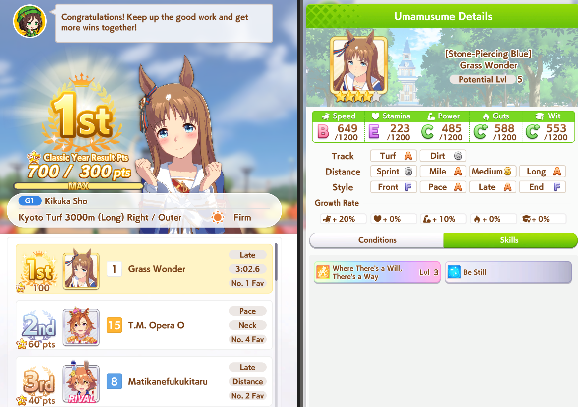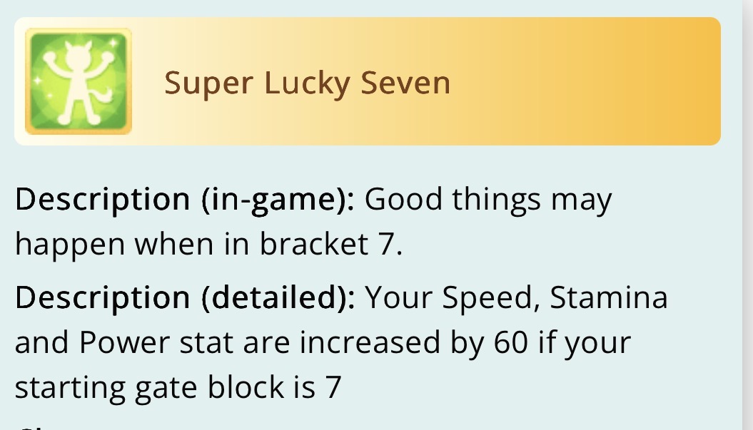 This skill is most useless fucking trash in the world, why tf would they even add it? Why is it trash? Well the conditions to activate are the following:1. Win 50/50 on a first event (50%)2. Win 50/50 on a second event(25%)3. Win 50/50 on a third event(12.5%)4. Get in gate 7(1.39%)5. Win a coin toss(0,695%)6. Wit check, assuming 1200 wit(0,646%)YOU WOULD THINK that a skill that is SO FUCKING RARE to obtain and proc would instantly guarantee you a win, but all it does is +60 to speed, power and stamina. You cant bet on being understammed every fucking race when this doesn’t proc, so stamina part is useless. Which leaves us at +60 speed and power. You get equivalent of 3 green skills at the cost of 3 green skills. That never fucking activate. Fucking FANTASTIC i’m telling you.