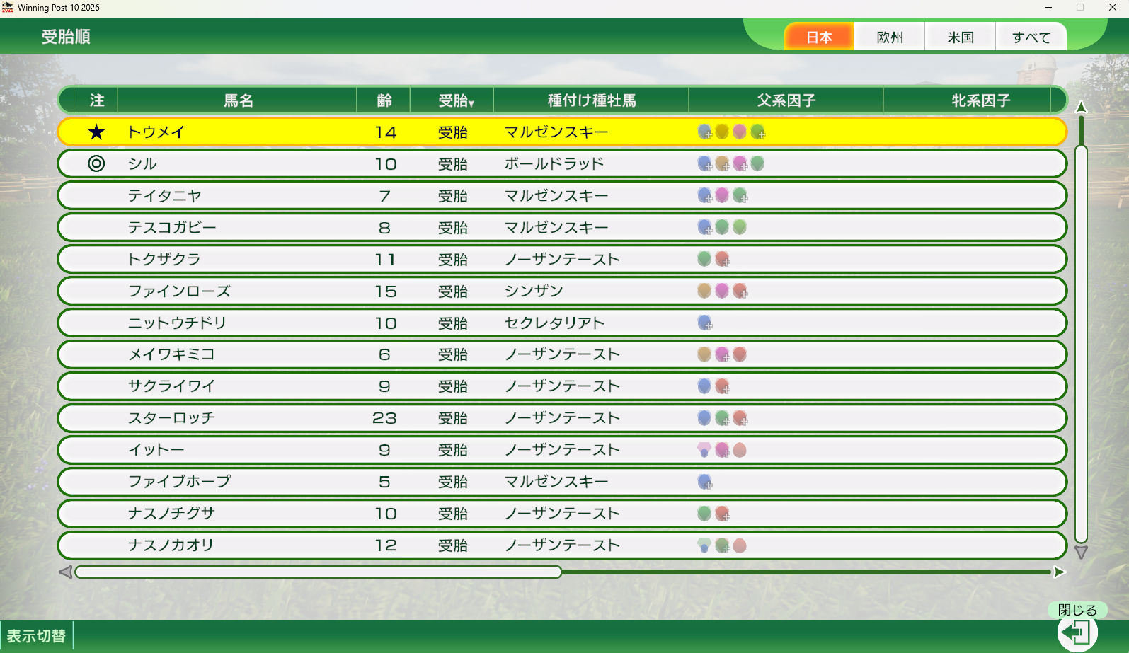 >most of my mares get covered by Maruzensky or Northern Taste