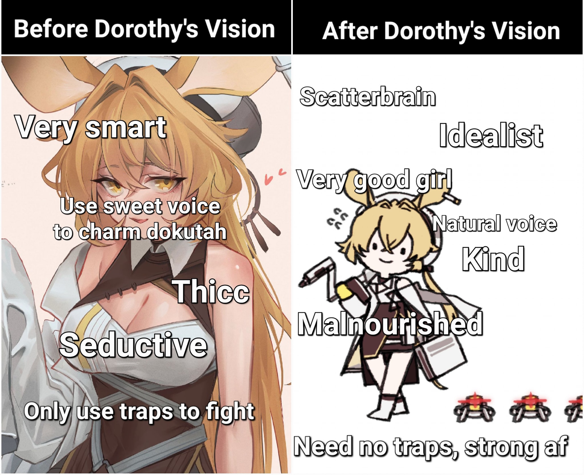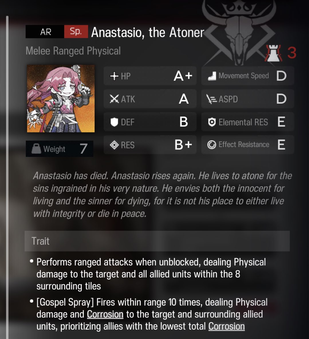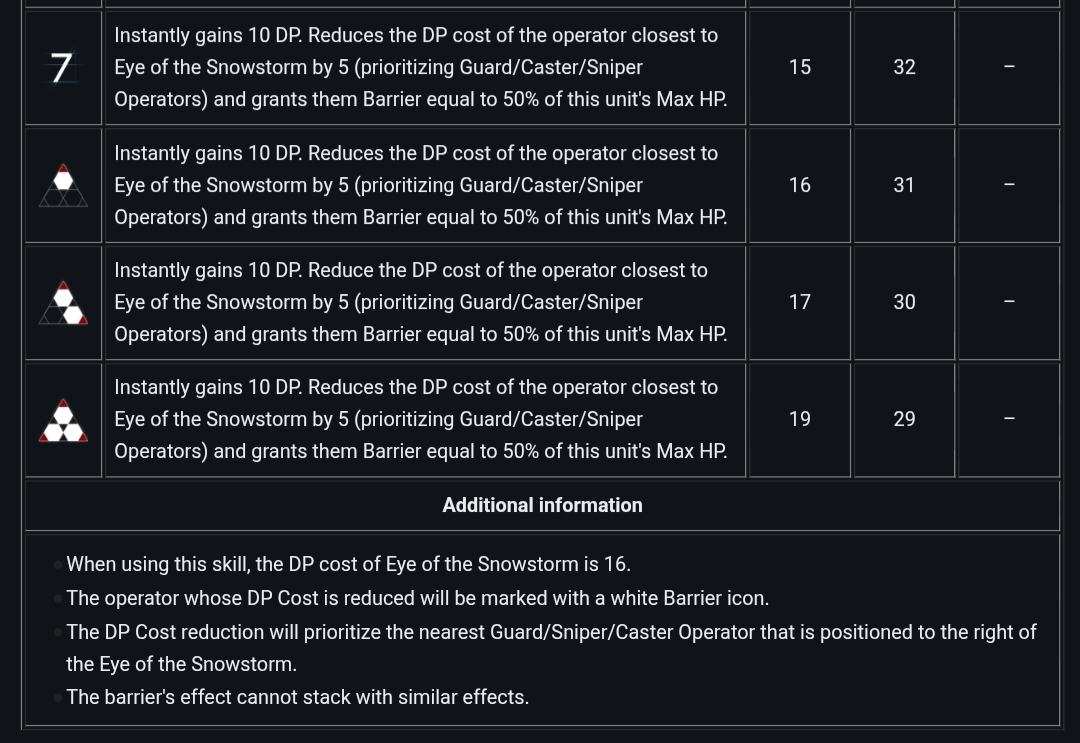 Is https://arknights.wiki.gg/ fucked for anyone else? The frames and the formatting are all screwed up like the html had a typo but it's like that on all the pages>>562987749You just outheal them until you block them then kill them. You can look up support carries and adapt it. Having thorns goes a good ways for easing the difficulty. Monthlies are boring but it's the single most economic gain in IS. You're cruising through literal months worth of sanity grinding promotion shit for free. It's nuts.Usually you just ask. Gladiia is a general purpose moderate laneholder. Her talent regen heals her, she's relatively low DP cost, and her module later gives her 27/30% damage reduction so she can hold better. This all-in-one modest dog killing damage, self-healing, and 2 block can at times free up a deployment slot by holding the lane alone giving you better flexibility in your picksKroos2 is a niche sidegrade to May who isn't guaranteed to obtain. Kroos2's permanent microstun avoids the downtime issue of may in exchange for weaker cc but once ramped up on s2 can microstunlock a slower enemy from hitting entirely. And now that you don't lose any sanity on loss you can lean on jank strats more than before.For the most part you just ask since there's some 5*'s that are good period, some that are good but you have better ops or ops that give more frequently used utility in the same role. You'll want to get used to making and keeping a screenshot of all your ups current and updated so you can post it as needed for hot takes.