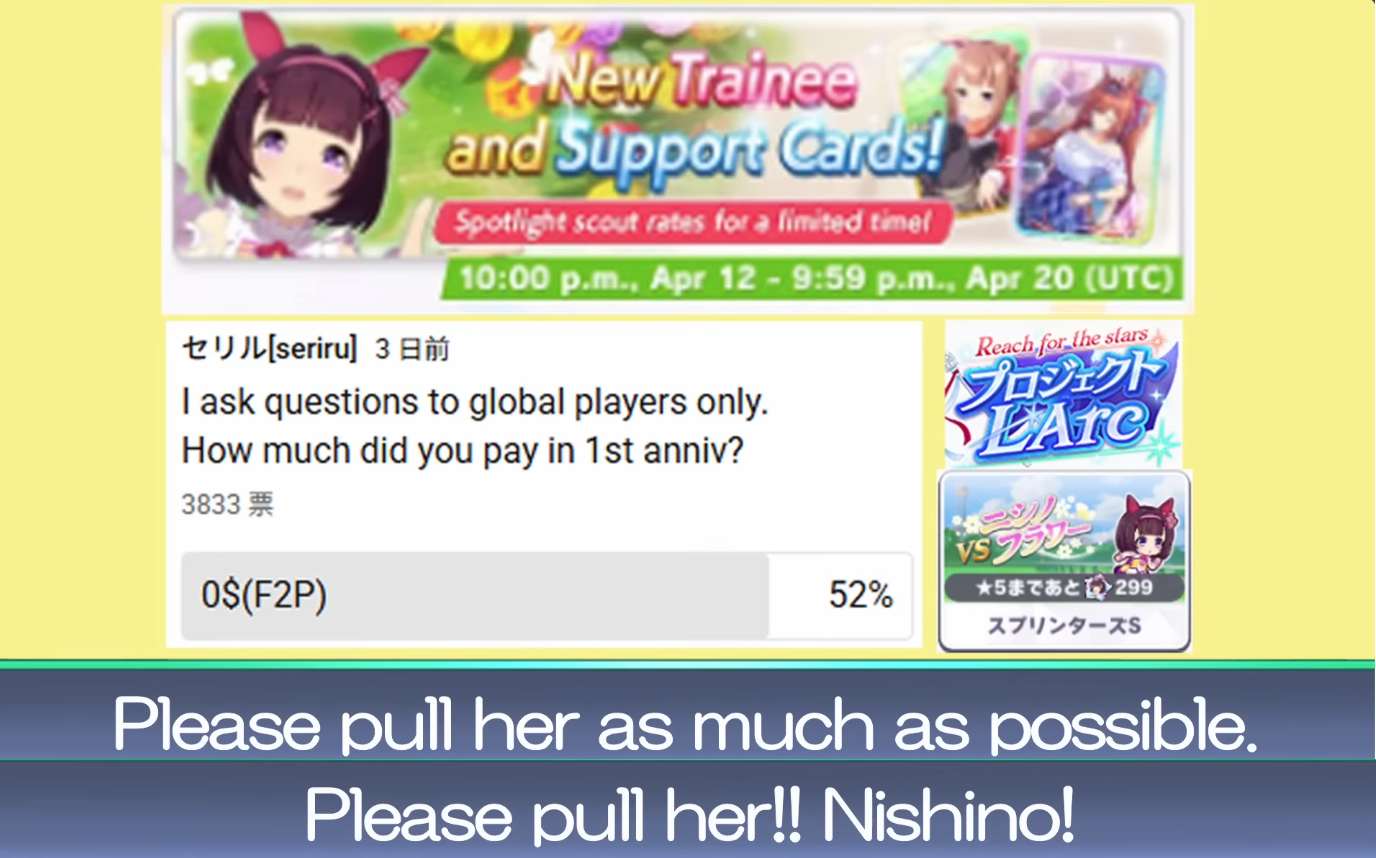 Previous: >>562943892>Global Game NewsLink your account to Cygames iDCurrent Scenario: Make A New Track aka "Trackblazer"Current Rate Up Trainee: Ballroom Seiun Sky (3*), Ballroom Fuji Kiseki (3*)Current Rate Up Support Cards: SSR Symboli Rudolf (STA), SSR Sirius Symboli (WIT)Current CM: Aries Cup - Nakayama Turf 2000mCurrent Event: Ligne Droite Story Event>Schedule03/02 - 04/14 - Halved TP Cost & 2x Career Mode Rewards04/12 - Nishino Flower (3*), Daiwa Scarlet (SSR), Sweepy (SR)04/20 - Yaeno Muteki (3*), Ines Fujin (SSR), Twin Turbo (SSR)04/20 - Aries Cup - Medium/Right/Spring/Firm/200004/26 - Golshi Week Celebration04/26 - Cheerleader Nice Nature (3*), Cheerleader King Halo (3*), Bamboo Memory (SSR), Seeking the Pearl (SSR)04/26 - Tracen Cheer Squad Story Event04/30 - Ines Fujin (3*), MR. C.B. (SSR), Tokai Teio (SR)https://pages.snep.pw/uma/anni-skill-changes>JP Game NewsCurrent Rate Up: Sakura Bakushin O (3* alt), North Flight (3* alt), SSR Daring Tact, SSR Daring HeartNew Scenario "Beyond Dreams" releasedTimeline: https://uma.moe/timelineCygames Webstore: https://webstore.cygames.com/en/umamusume_en>Thread Clubshttps://rentry.co/umaglobalclublistYou must be E3 (20k points) to join a circle. Apply with /uma/ or /vg/ in your profile or post ID in the thread.>All Guides & Resourceshttps://rentry.org/uma26Game databasehttps://gametora.com/umamusume (Click the gear to switch between JP / global server info)A basic guide for newfagshttps://rentry.org/umaglobalFind networks if your region is blocked from the game or clienthttps://www.umavpn.topSeiyuu & Concertshttps://rentry.org/umstUmamusume Birthday Calendarhttps://ウマ娘.攻略.tools/events/birthdayUma Texthttps://umareader.idsmile.xyzCustom Stickershttps://schizo.farm/resources/stickers
