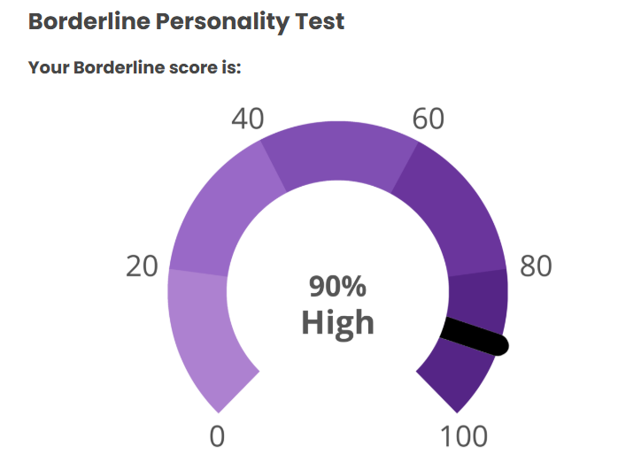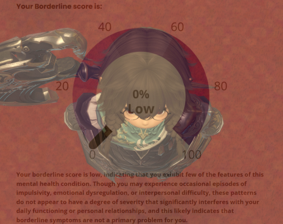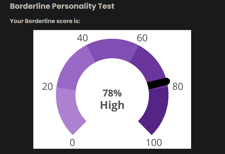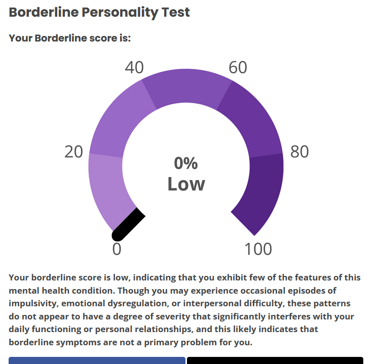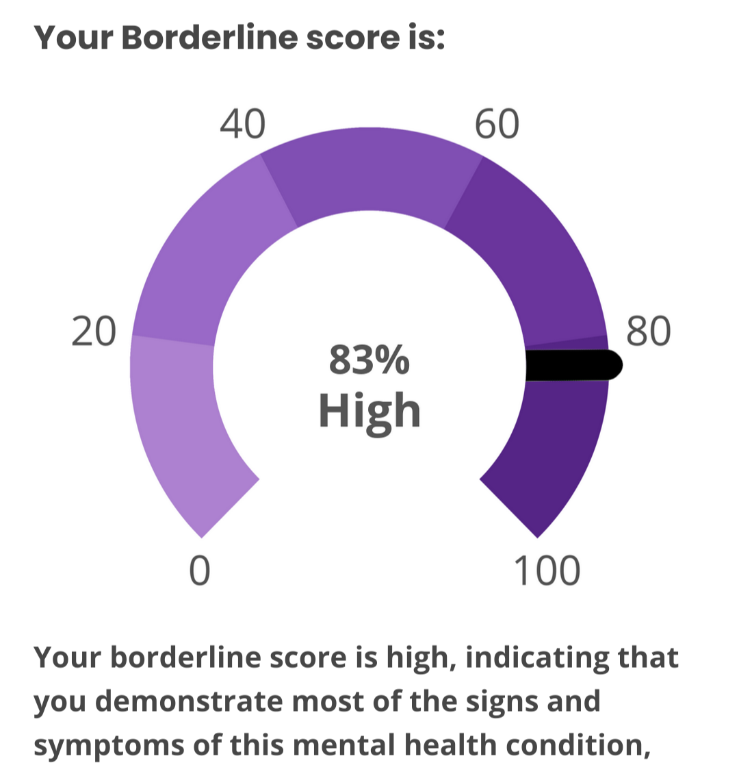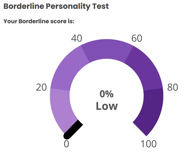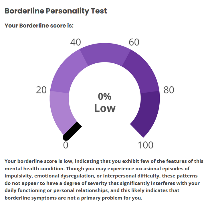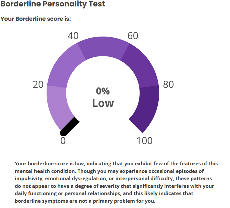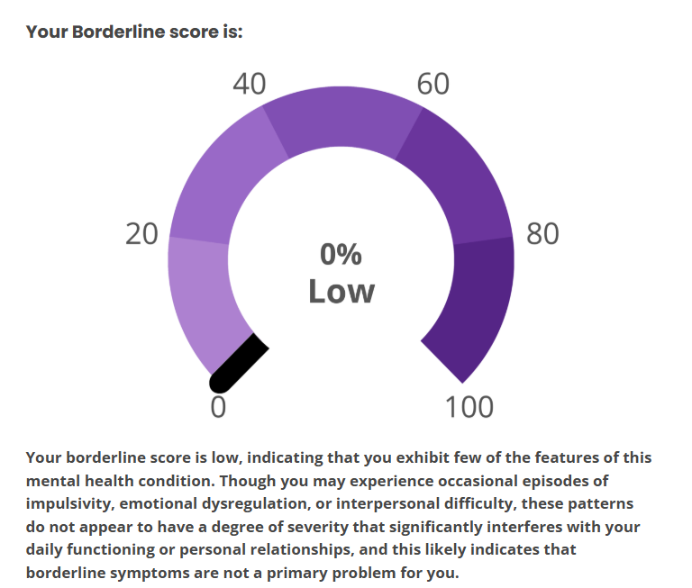 hmm...>>562986567I responded 100% truthfully including some stuff that would probably flag but idk maybe the things that are not bpd just knocks the score down to the negatives and the lowest it shows is 0%