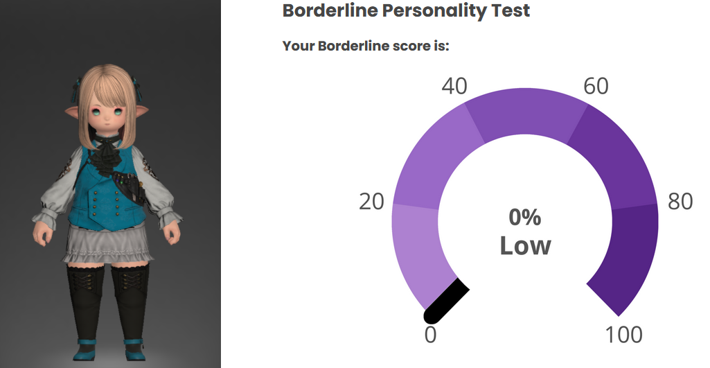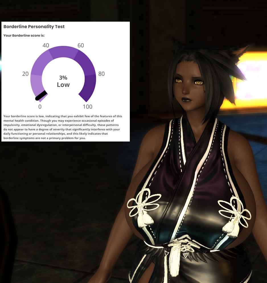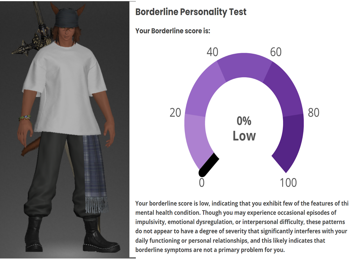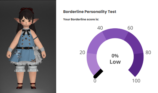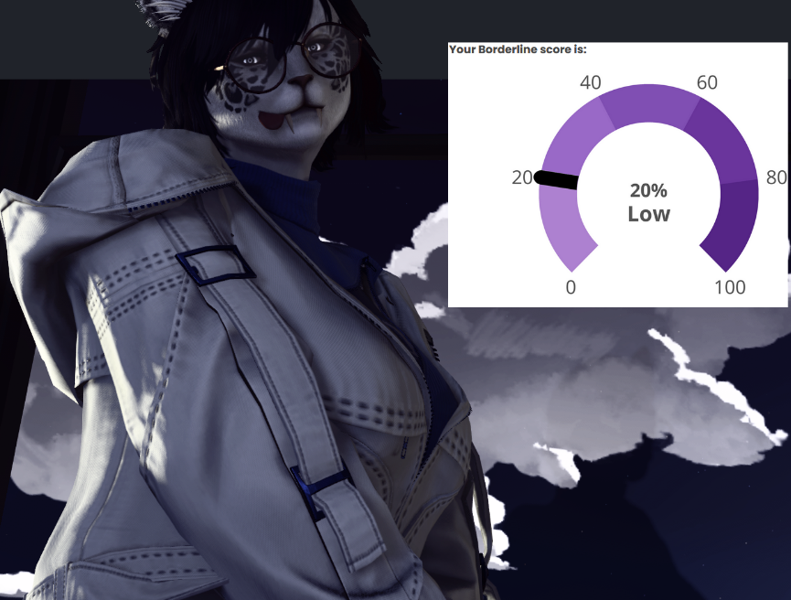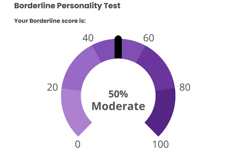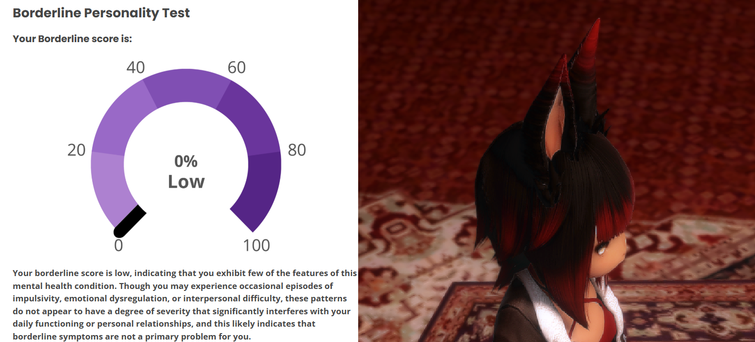 hmm...>>562986567I responded 100% truthfully including some stuff that would probably flag but idk maybe the things that are not bpd just knocks the score down to the negatives and the lowest it shows is 0%