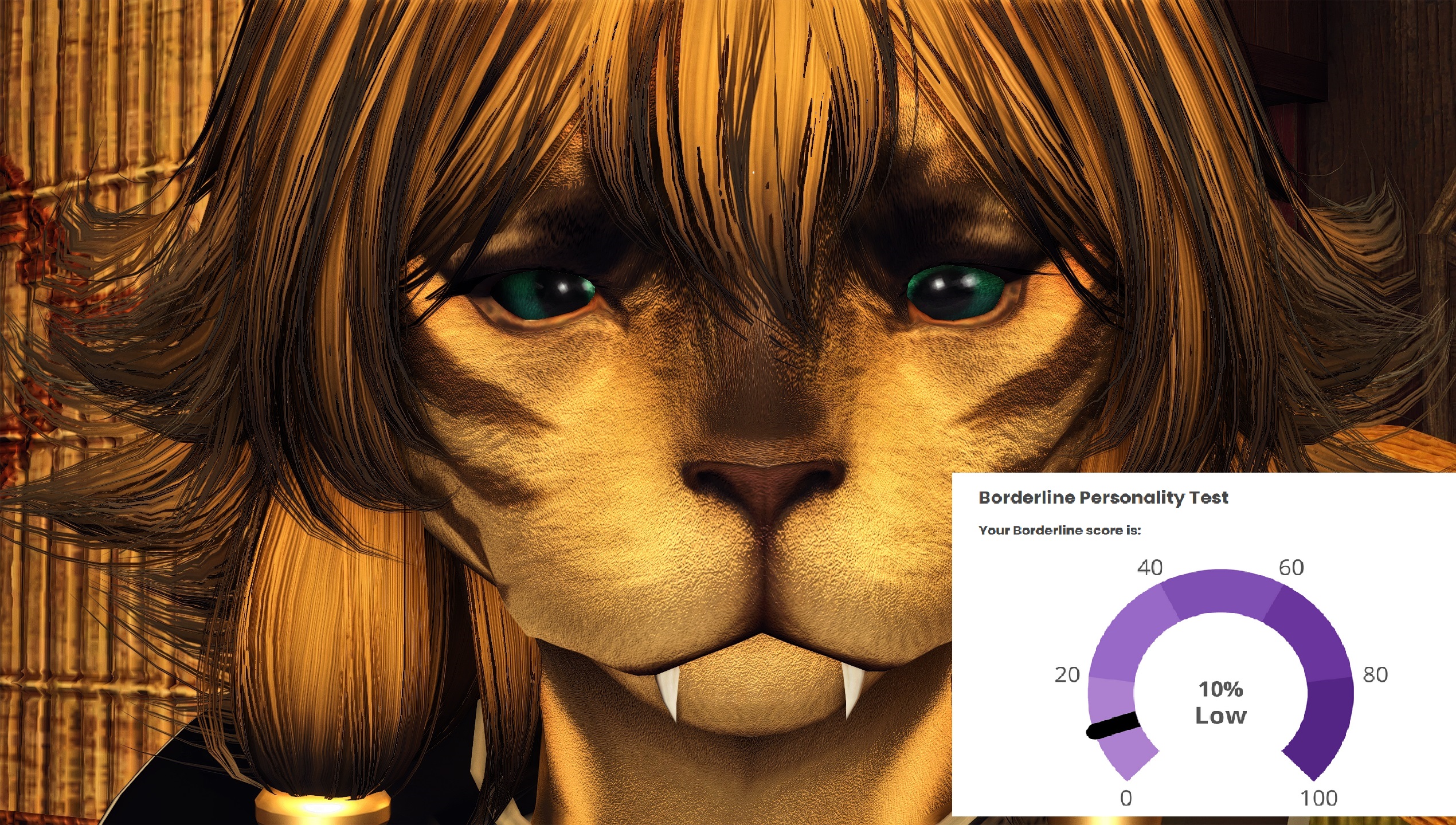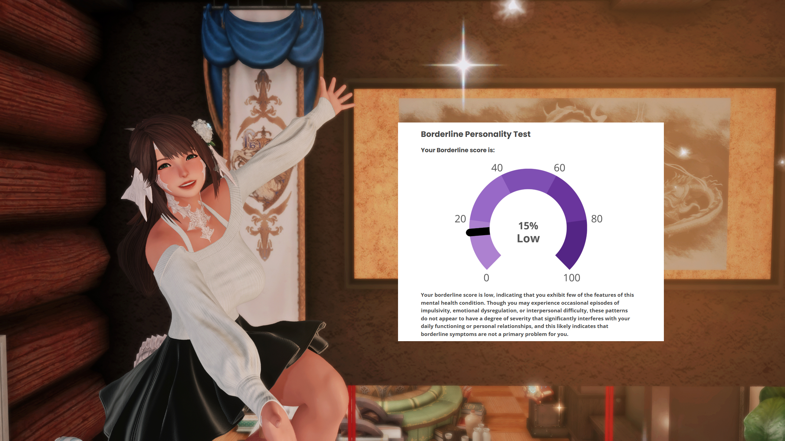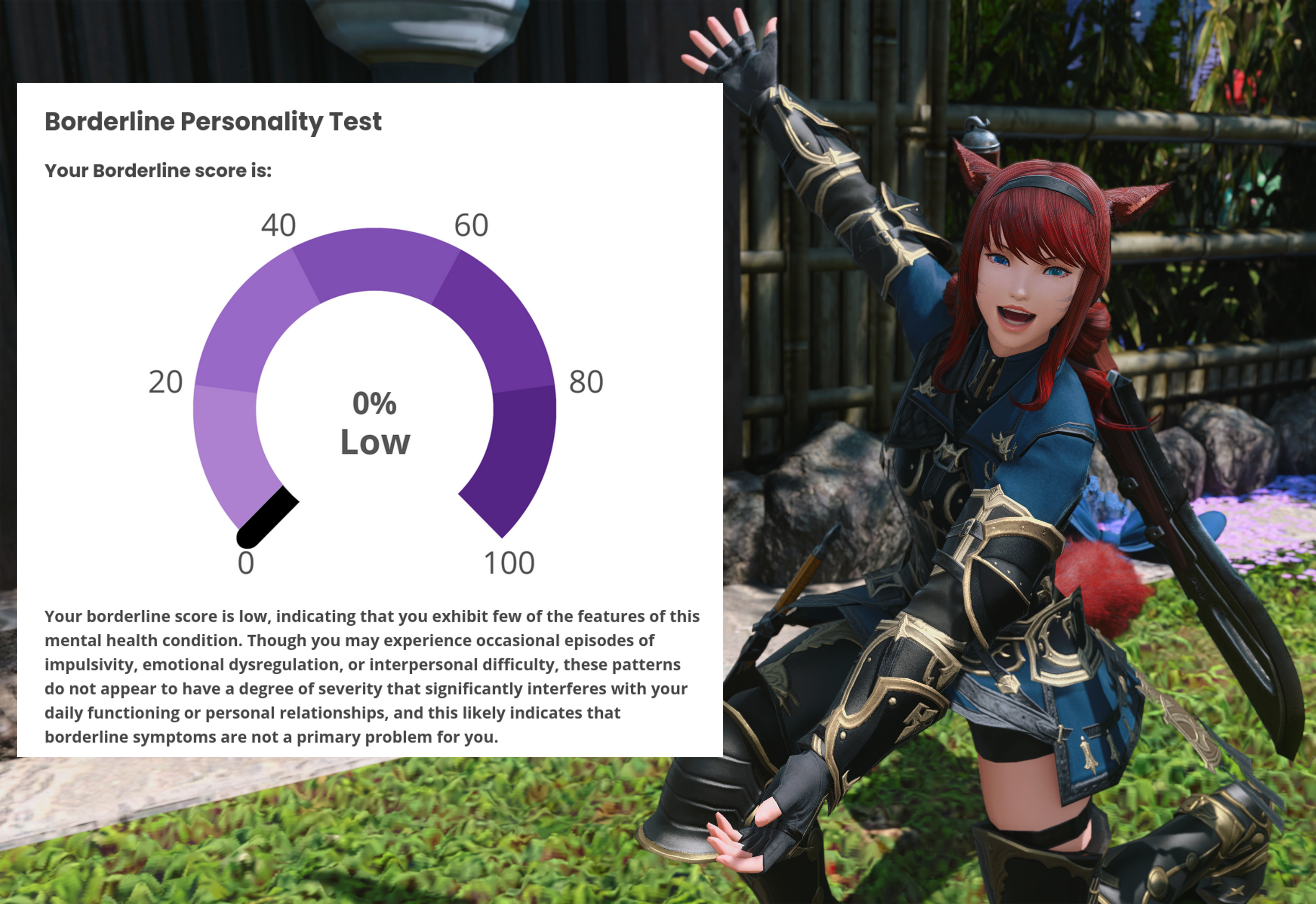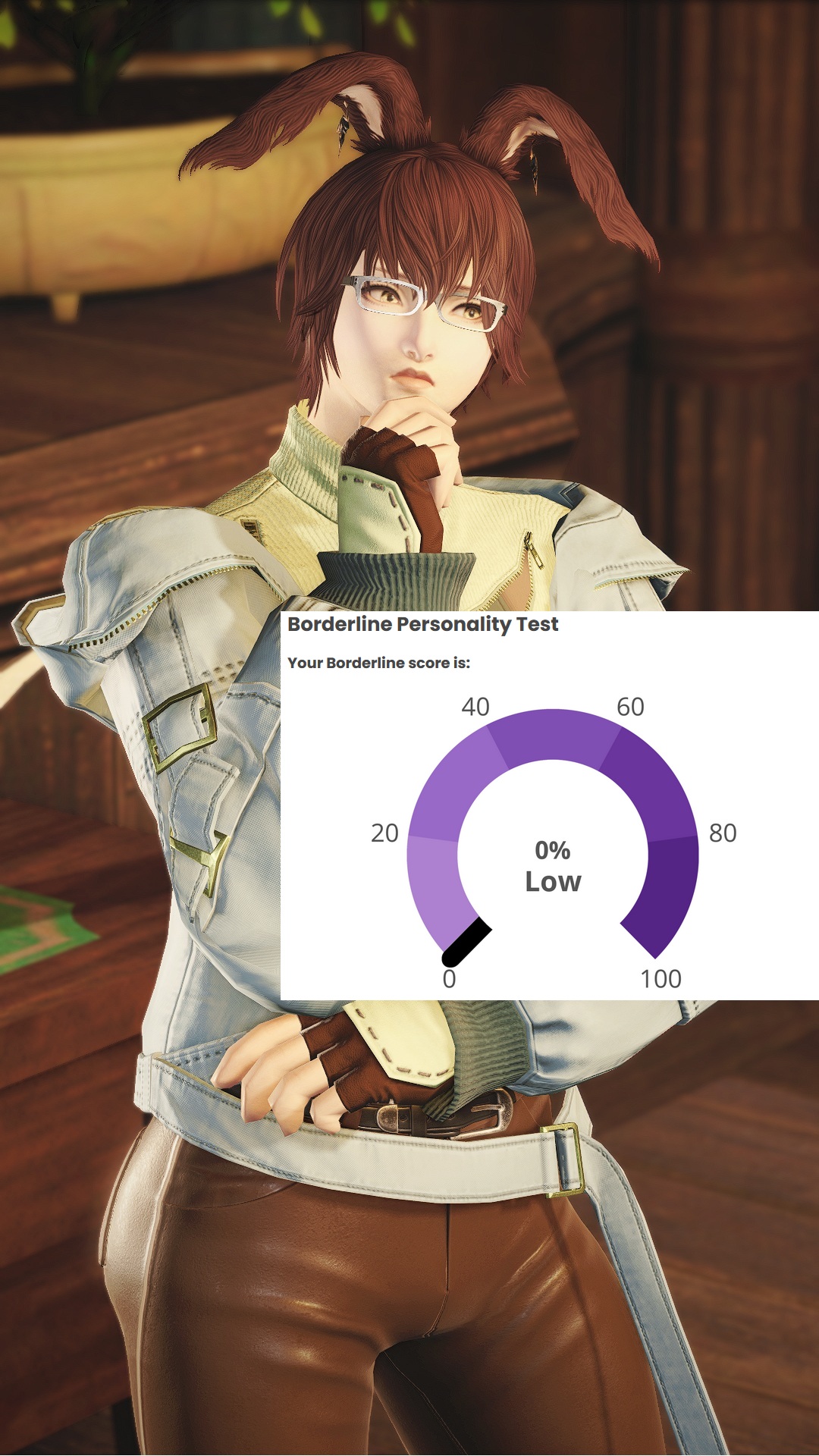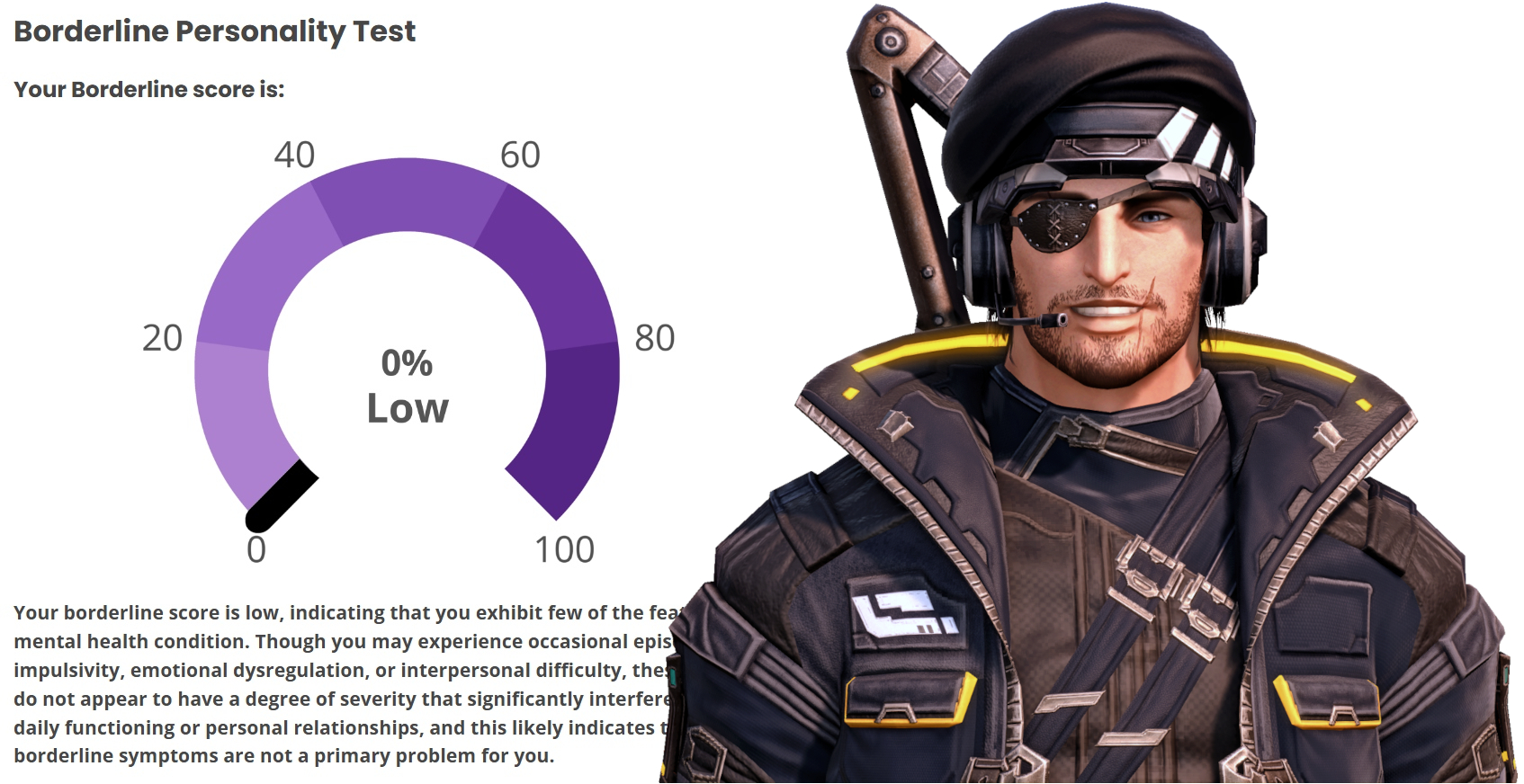 hmm...>>562986567I responded 100% truthfully including some stuff that would probably flag but idk maybe the things that are not bpd just knocks the score down to the negatives and the lowest it shows is 0%