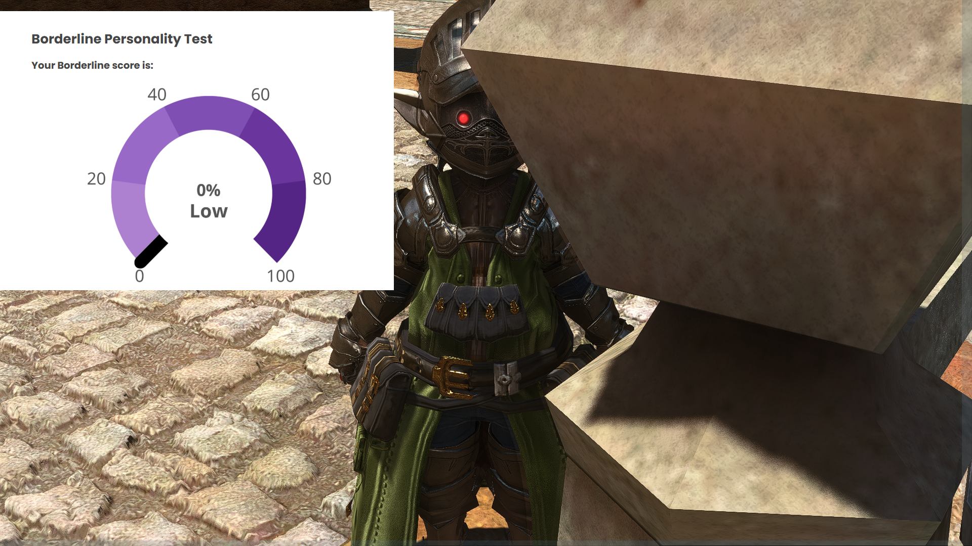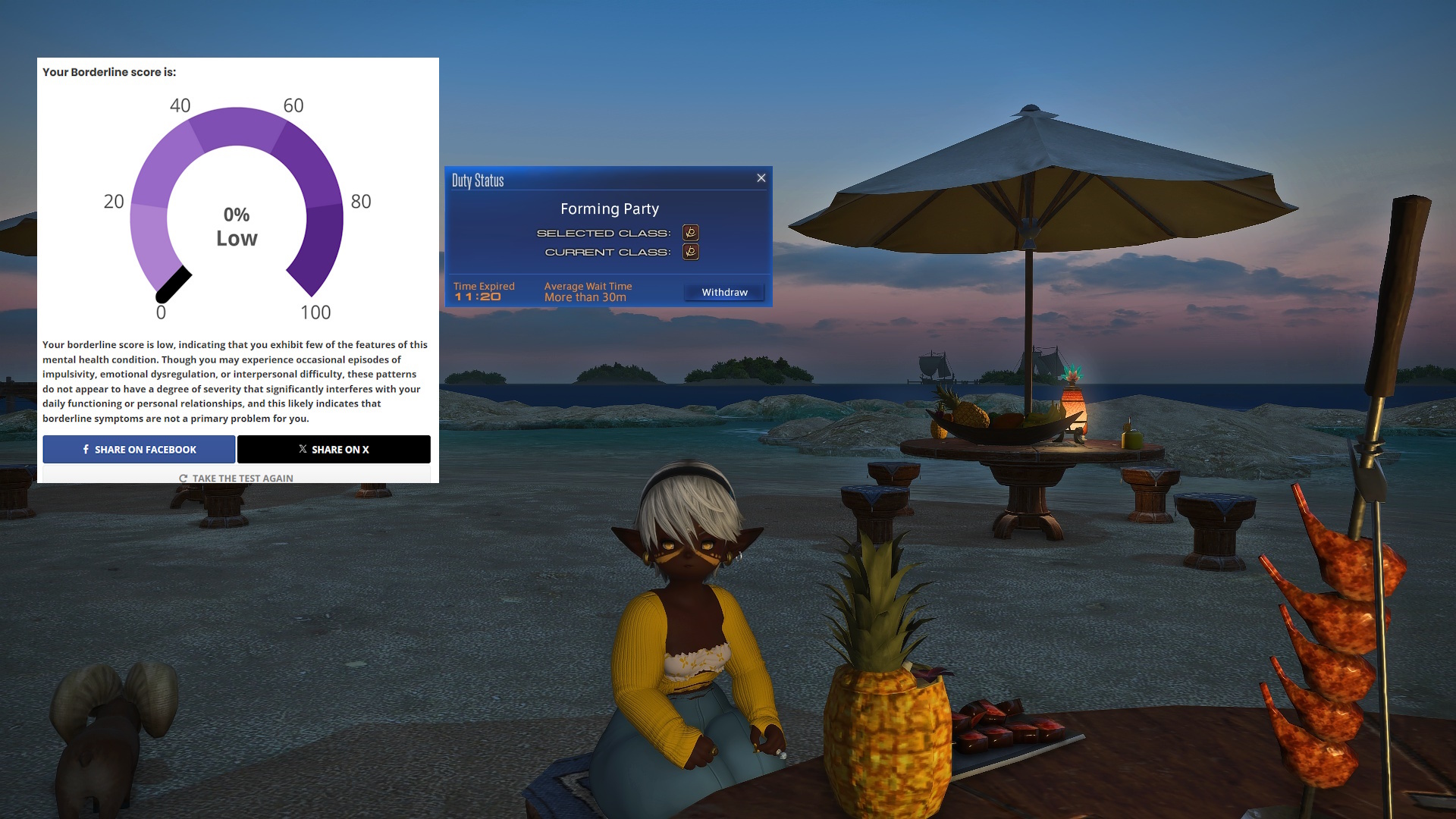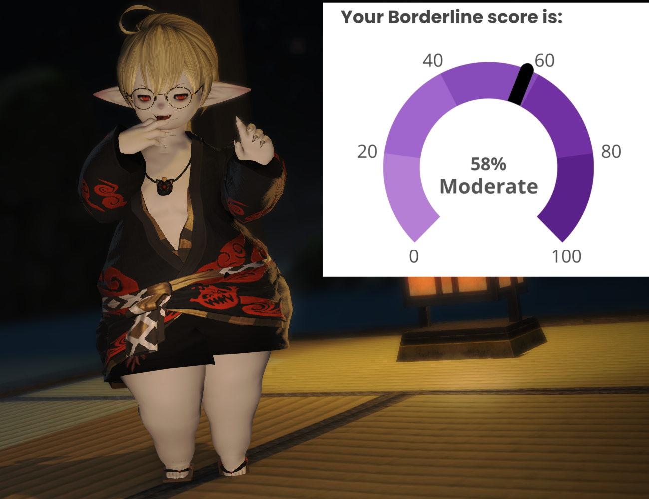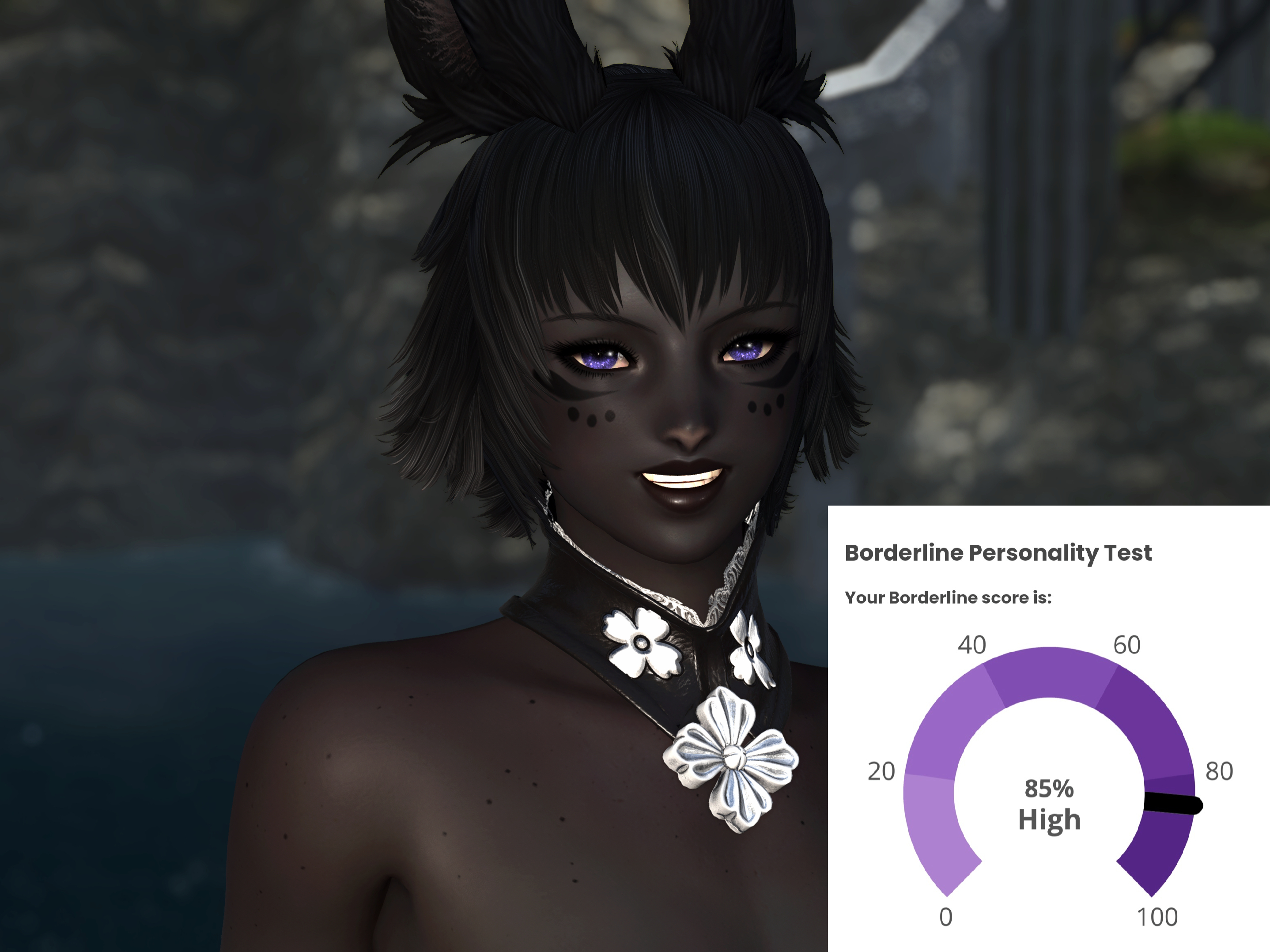 hmm...>>562986567I responded 100% truthfully including some stuff that would probably flag but idk maybe the things that are not bpd just knocks the score down to the negatives and the lowest it shows is 0%