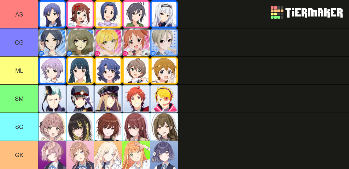 >>563017498>ASChihaya, Ritsuko, Azusa, Takane, Iori>CGUzuki, Chitose, Airi, Noriko, KWSM>MLKaren, Momoko, Anna, Kotoha, Fuuka>SMHideo, Takeru, Makio, Seiji, Kanon>SCKogane, Mano, Asahi, Kiriko, Yuika>GKRinami, Saki, Mao, China, Tsubame