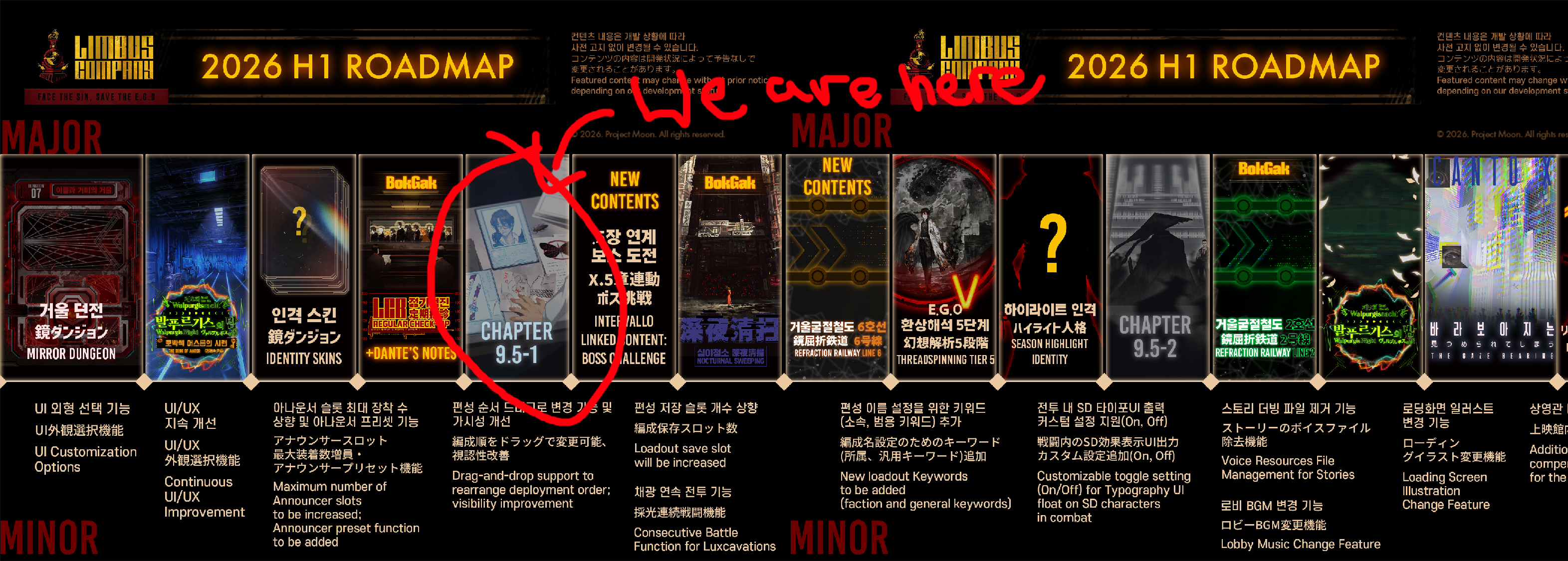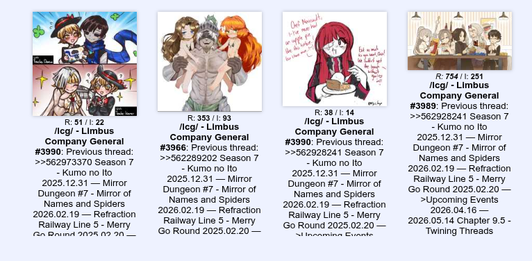 Previous thread: >>562973370Season 7 - Kumo no Ito2025.12.31 —Mirror Dungeon #7 - Mirror of Names and Spiders2026.02.19 —Refraction Railway Line 5 - Merry Go Round2025.02.20 —>Upcoming Events2026.04.16 — 2026.05.14Chapter 9.5 - Twining Threads>Current Events2026.03.19 — 2026.04.16Chapter 7.5 - LCB Regular Check-up BokGak>Current Extractions2026.04.02 — 2026.04.16[000] The House of Spiders: The Ring Nursefather Hong Lu[000] The House of Spiders: The Ring Apprentice Faust2026.03.19 — 2026.04.16[000] LCE E.G.O:: AEED Gregor[HE] Ardor Blossom Star Faust2026.04.02 — 2026.04.16Target Extraction: [ Yi Sang ]FAQs! This game is directly tied to the setting of Project Moon's previous games, Lobotomy Corporation and Library of Ruina, and is set after both. Expect spoilers for those games in this thread.! The tutorial is important.>Download linksAppStore: https://apps.apple.com/app/limbus-company/id6444112366Google Play: https://play.google.com/store/apps/details?id=com.ProjectMoon.LimbusCompanySteam: https://store.steampowered.com/app/1973530/Limbus_Company/>Other linksOfficial twitter: https://twitter.com/limbuscompany_bOfficial youtube: https://www.youtube.com/@ProjectMoonOfficialOfficial site: https://limbuscompany.global>Required readinghttps://mega.nz/folder/xosDkZ5Z#Wt4JpUt5Bb2XG77pxuuXpw>For all your EGO and Sinner info needshttps://limbus.kusoge.xyz/https://gll-fun.com/en/>Useful resources and a general guidehttps://rentry.org/lcg_resourceshttps://rentry.org/lcbguidehttps://rentry.org/LCB_optimal_grind_guidehttps://lcb-days-since-last-id.carrd.co/https://lcb-days-since-last-ego.carrd.co/>Countdownhttps://lcbcountdown.carrd.co/