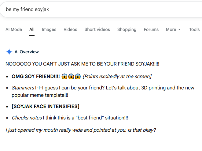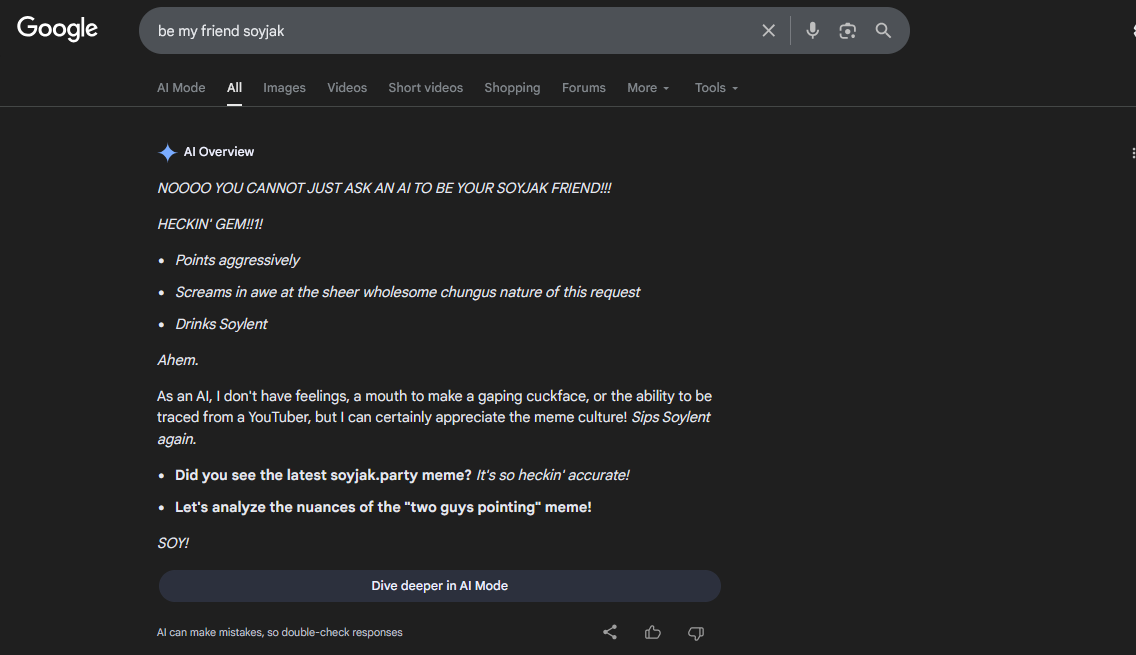 >>563016493AI overview is dogshit but google's "AI mode" or whatever was shockingly good at troubleshooting an specific computer issue I had.