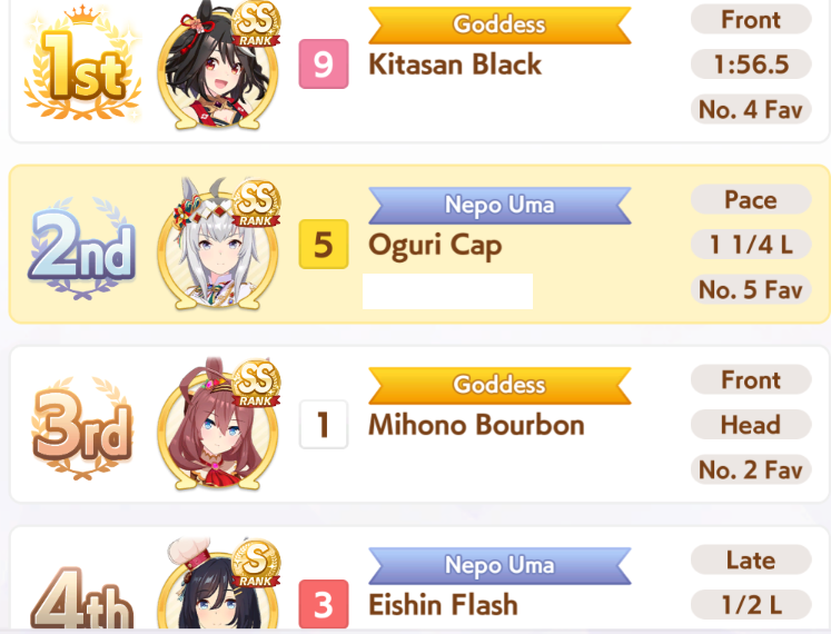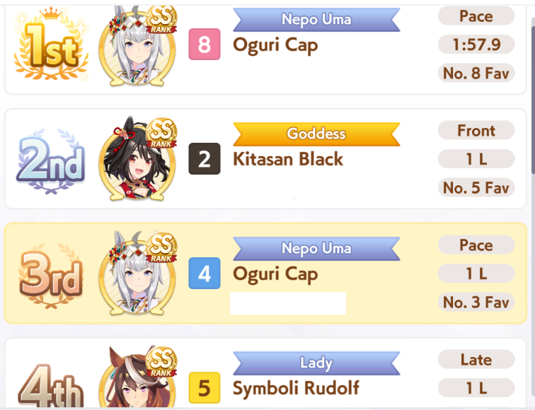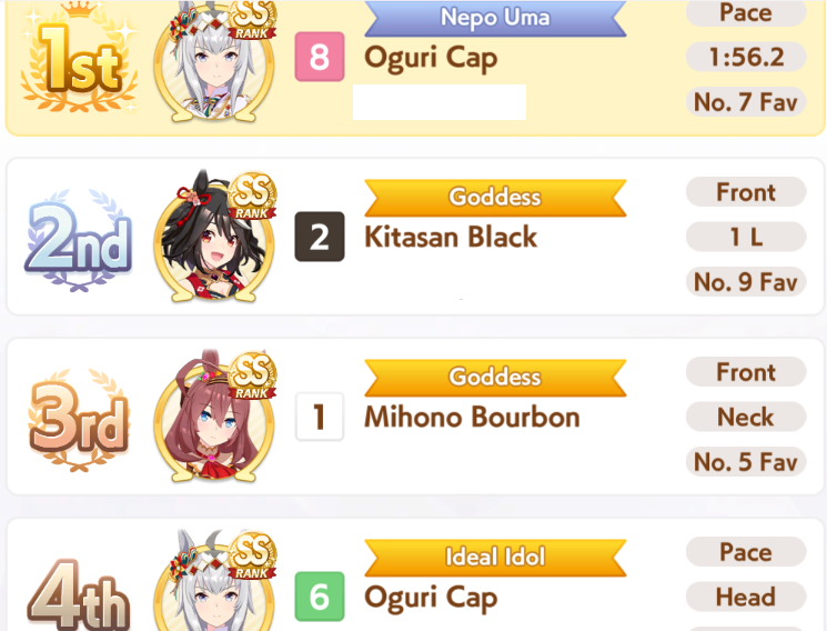 >>563038110only thing I have seen consistently beat Oguri is double front+debuffer (dominator and hesitant pace)Even then Oguri just kinda wins a lot