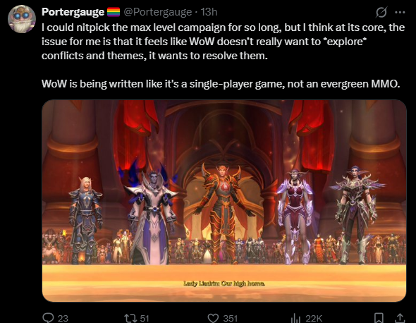 >>563082837Problem is once you do this you can't ever explain away why the expansion villain can't just port out at the end of their raid encounter