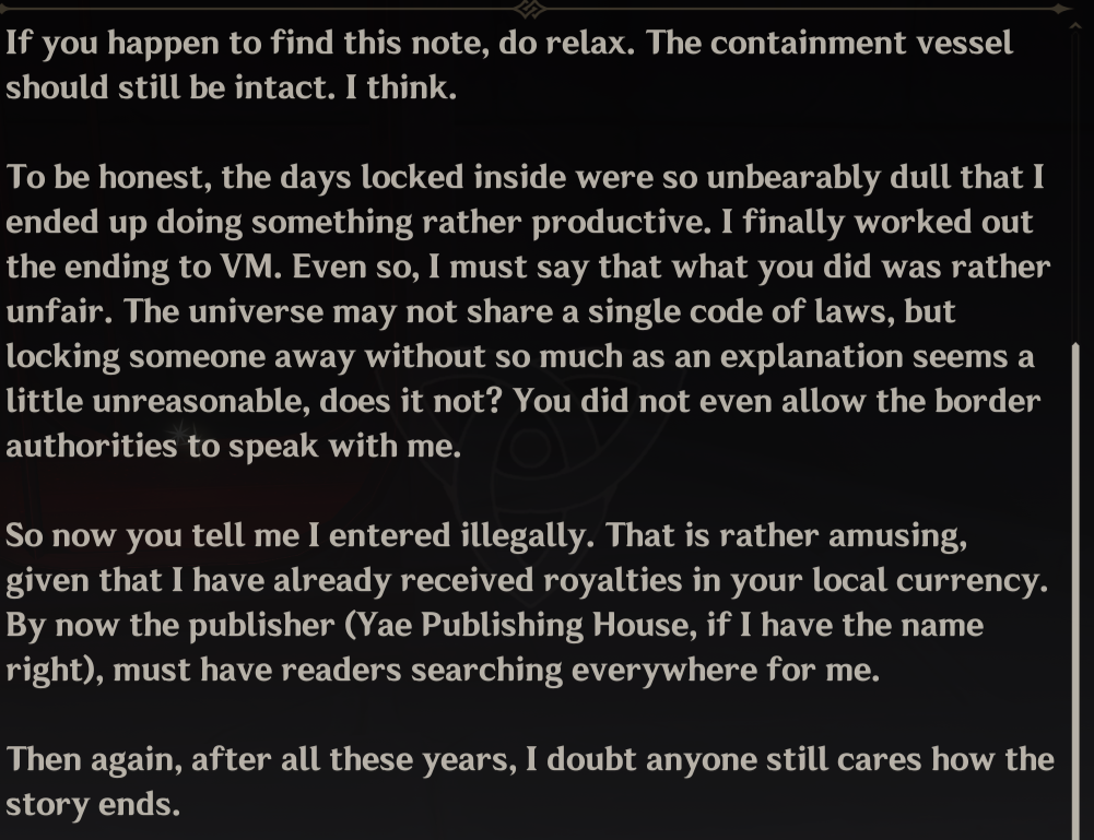 >>563054071Well you see, in Nieblungs story there was a voyager that came to him to warn him about the destruction of the world which led him to leave teyvat to find a solution in the meantime teyvat was conqured by the HP. Now that you know the Spaceship passed teyvat before who could the voyager be...