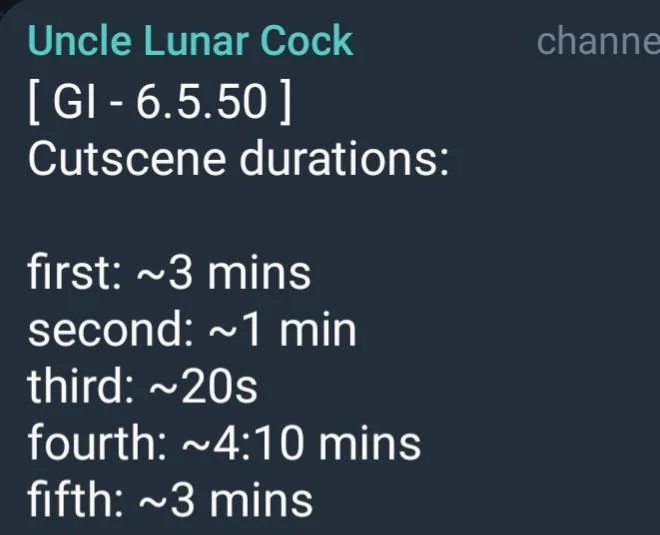 6.6 Quest Cutscene Durations Via Uncle Lunar C*ck>11:30 minutes of cutscenesDamn next archon quest is stacked.