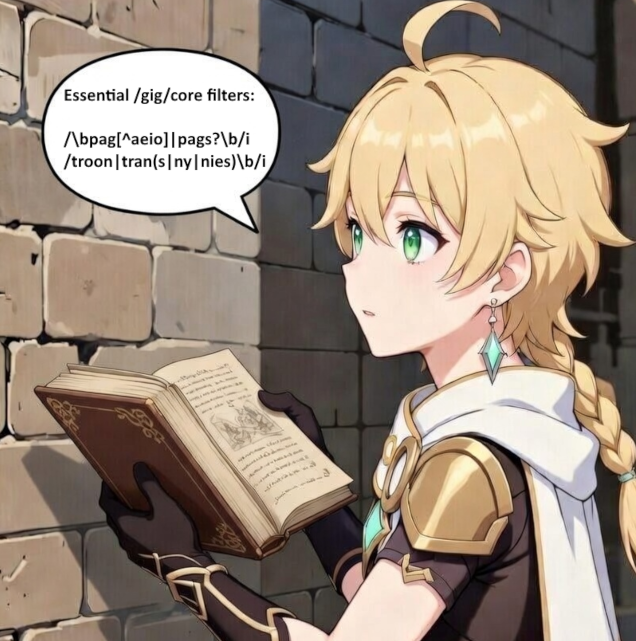 Essential /gig/core filters:/\bpag[^aeio]|pags?\b/i/troon|tran(s|ny|nies)\b/i