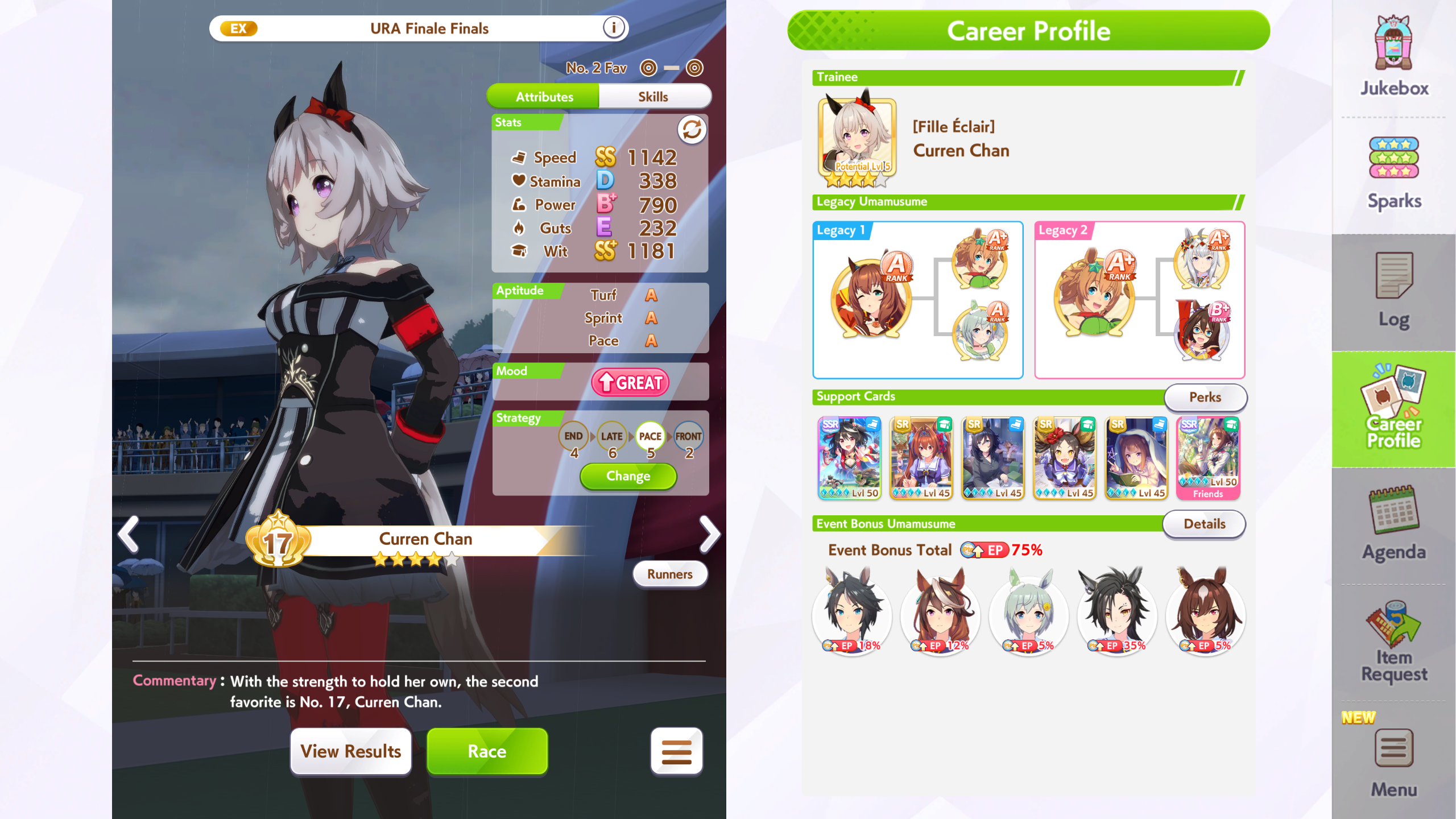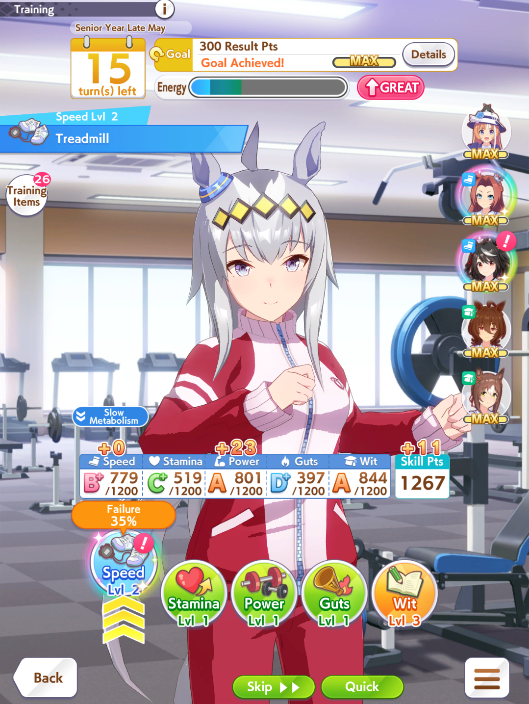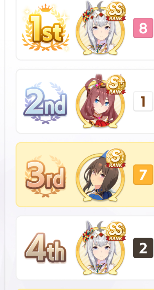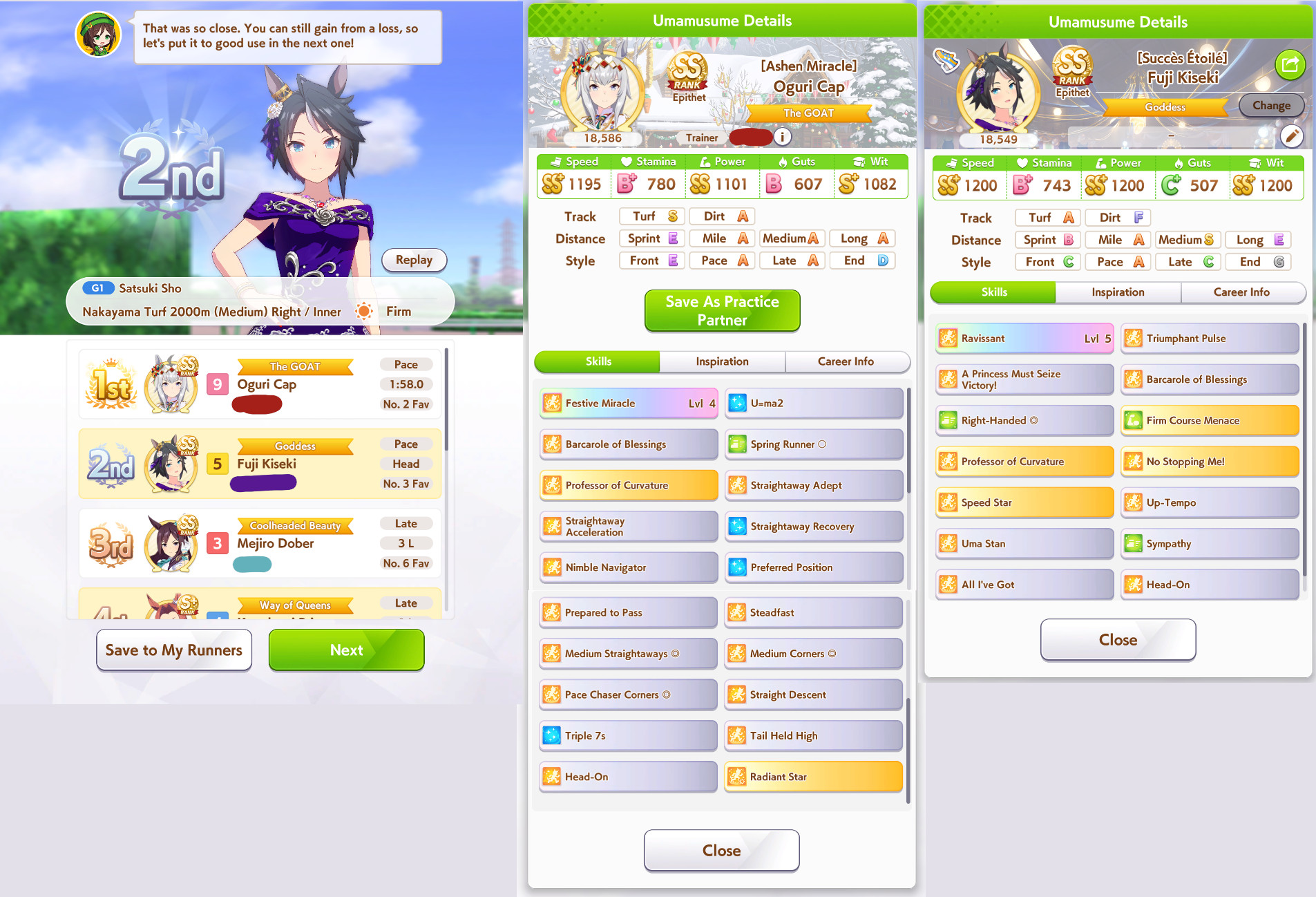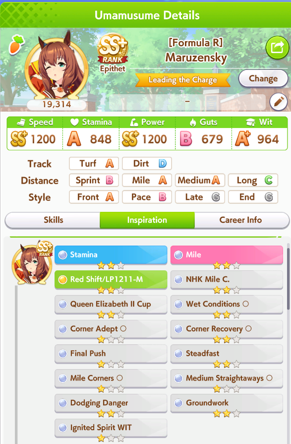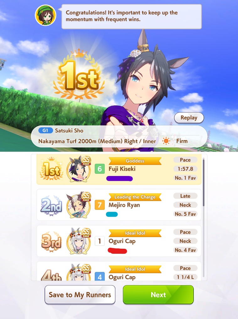 >got a really good Maru with all the right skills but no TTL and I went with triple 7s for the recovery so her early + midrace is way weaker than other fronts>got another one with better midrace + TTL + better stats and she's noticeably stronger at contesting angling but no medium S means she loses to weak XOguriThe grind never ends, I'm starting to consistently pump out SS though so I'd like to think I'm getting better at MANTBlazing