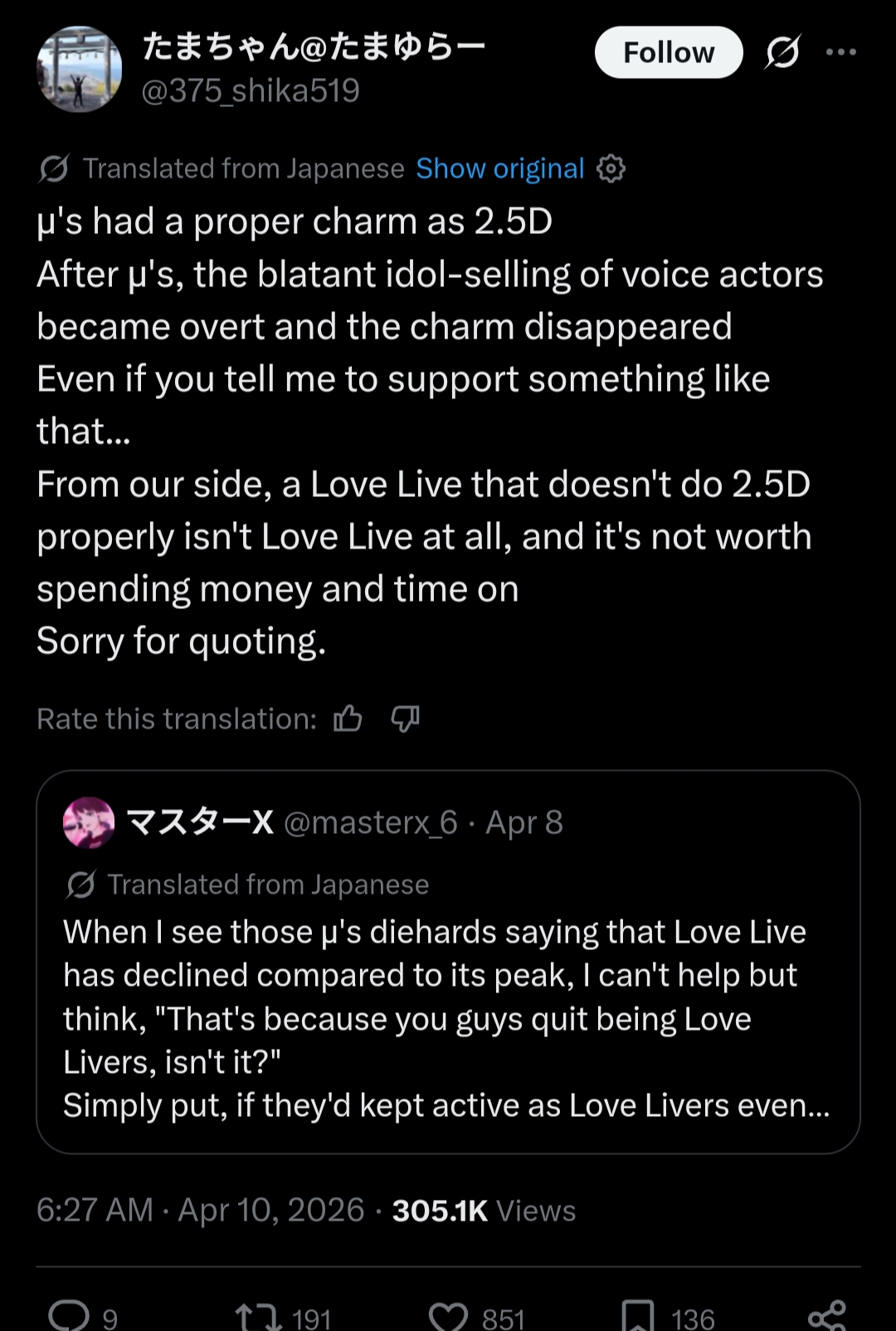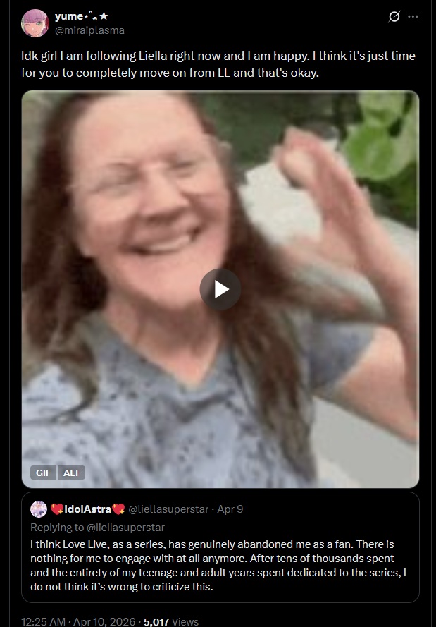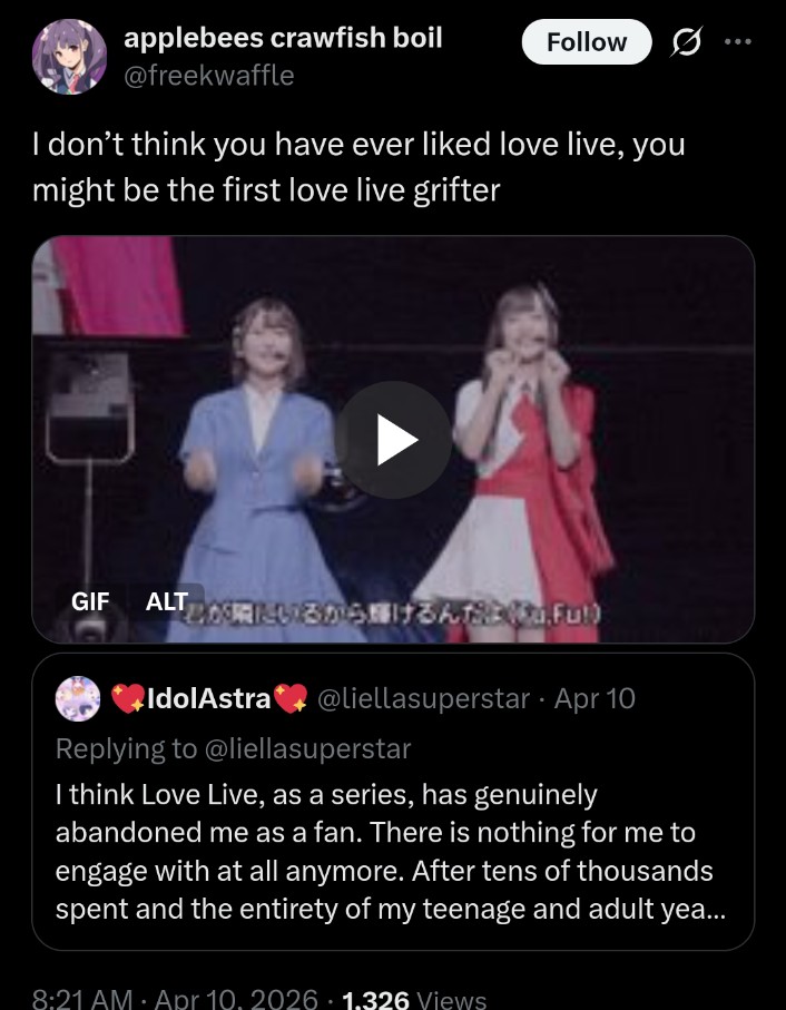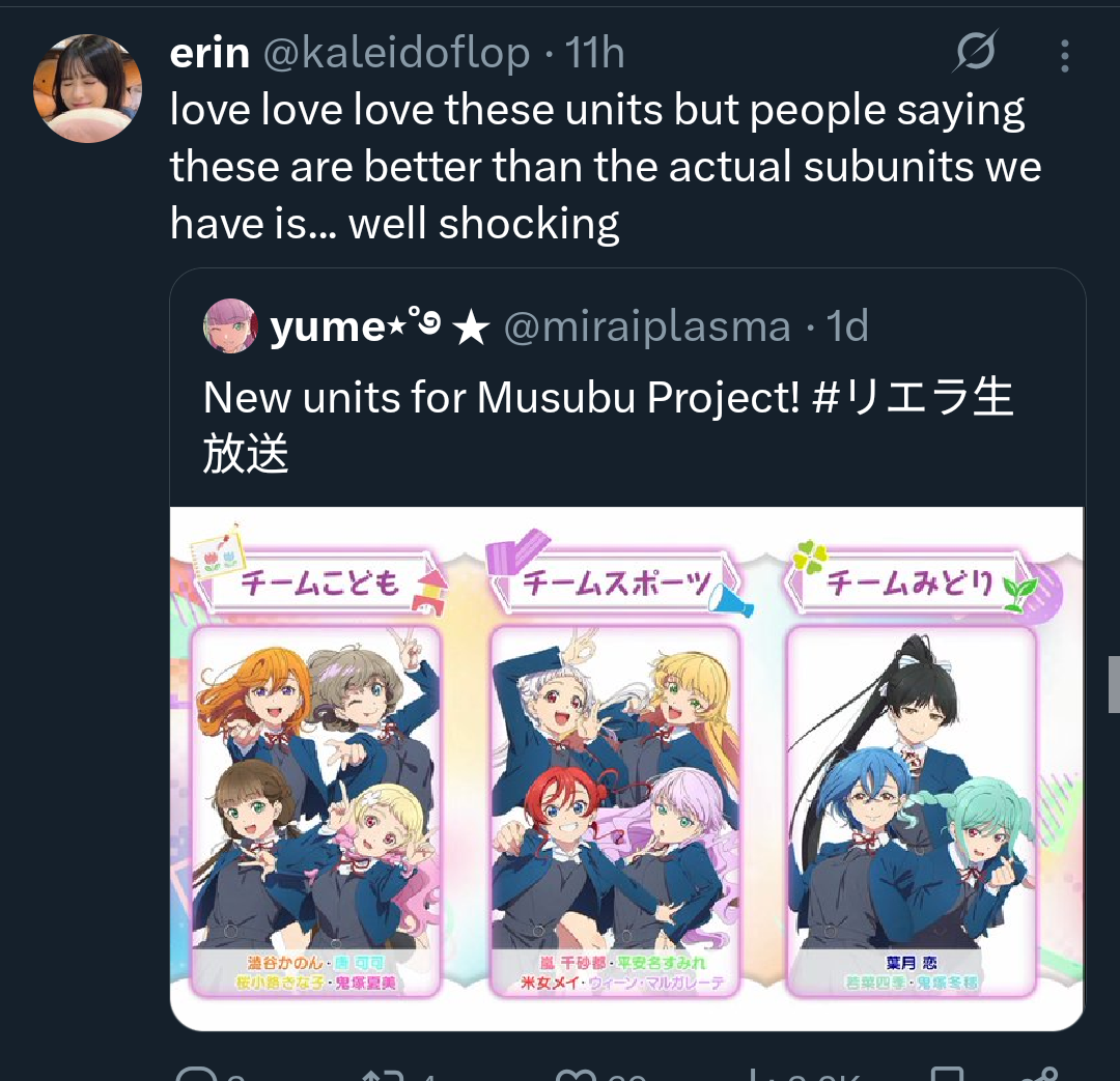 >seeing Liella 2Dfags and 3Dfags infighting in Xitter