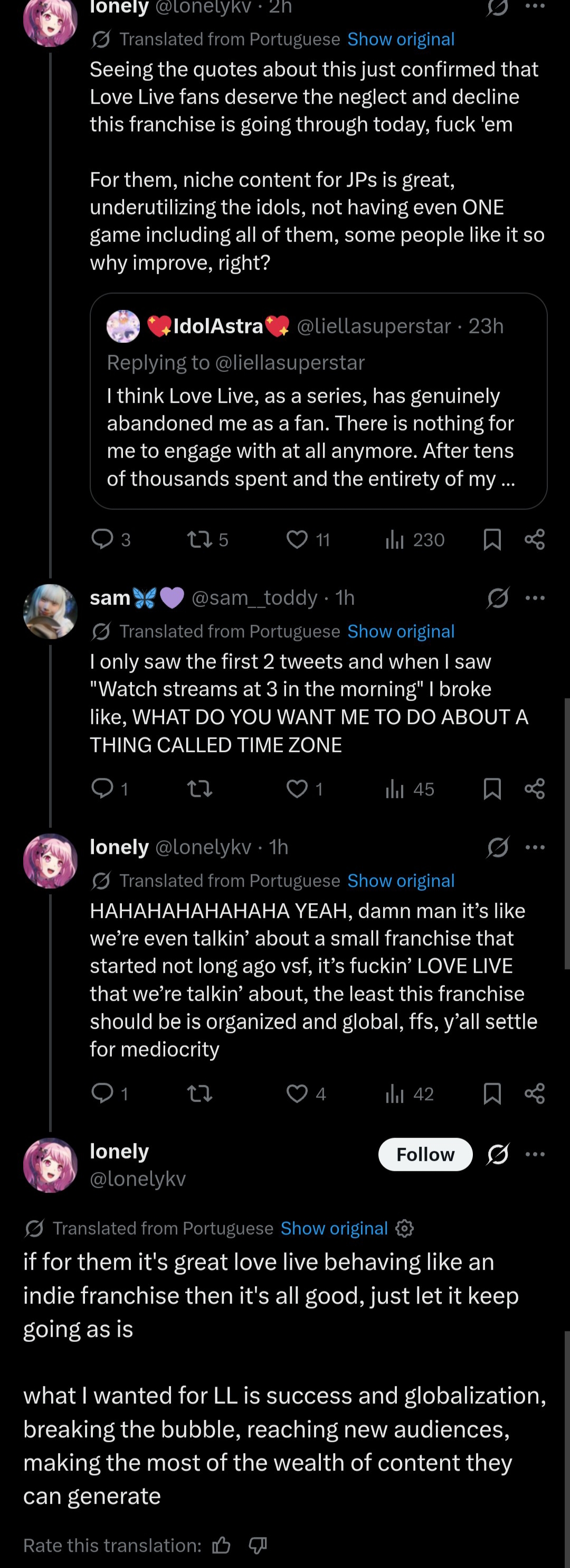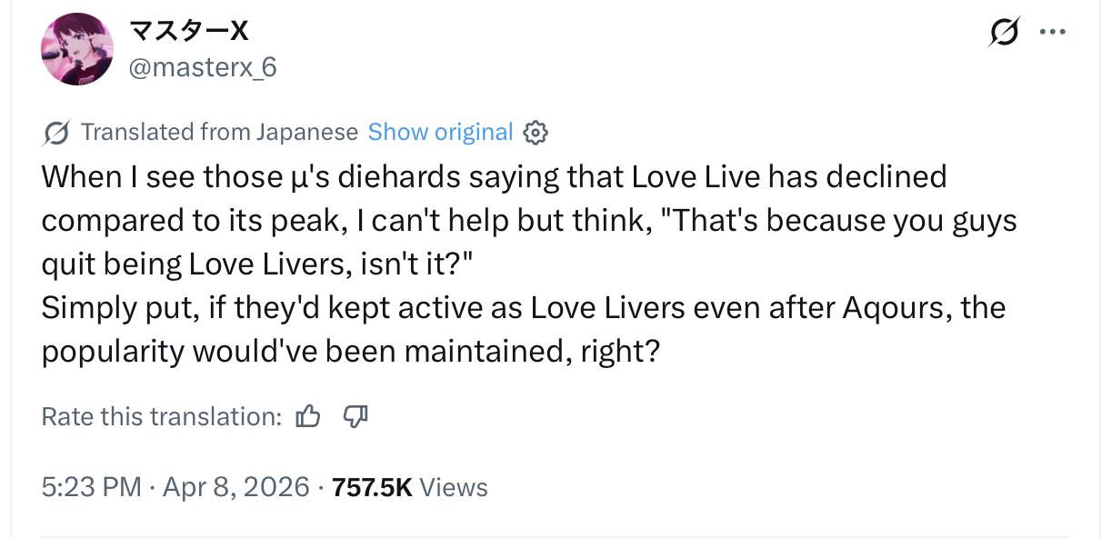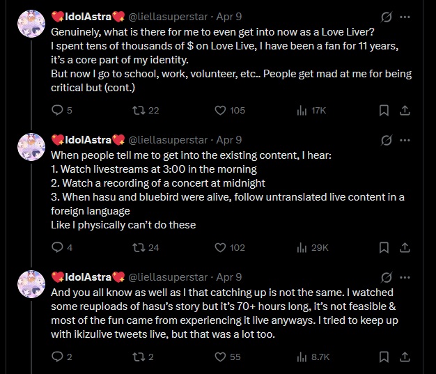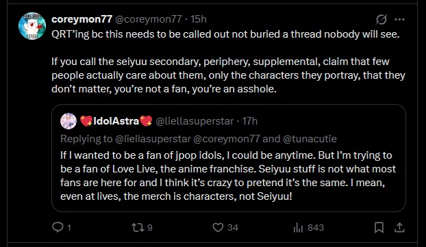 Hes also completely right about seiyuu being secondary. Anyone can voice a raibu, some will do it better than others. Love live forgot that people COME for the 2D girls and after becoming invested maybe they stat for something else. Shilling your seiyuu nonstop has detrimental effects, its so bad that a liella fan would barely care to watch any superstar anime. Shits almost unthinkable but it’s happening already. Supporting a seiyuus solo career doesn’t hell the franchise itself so these people do jackshit for us