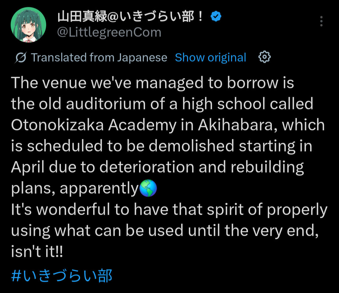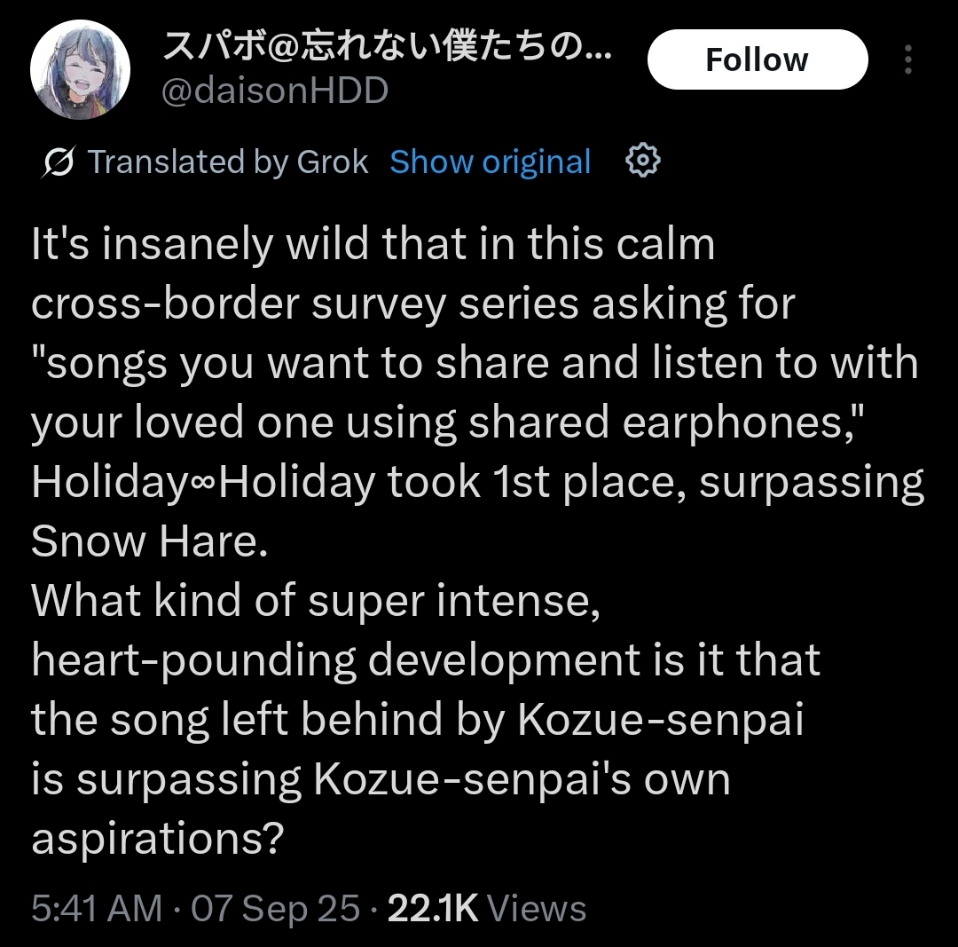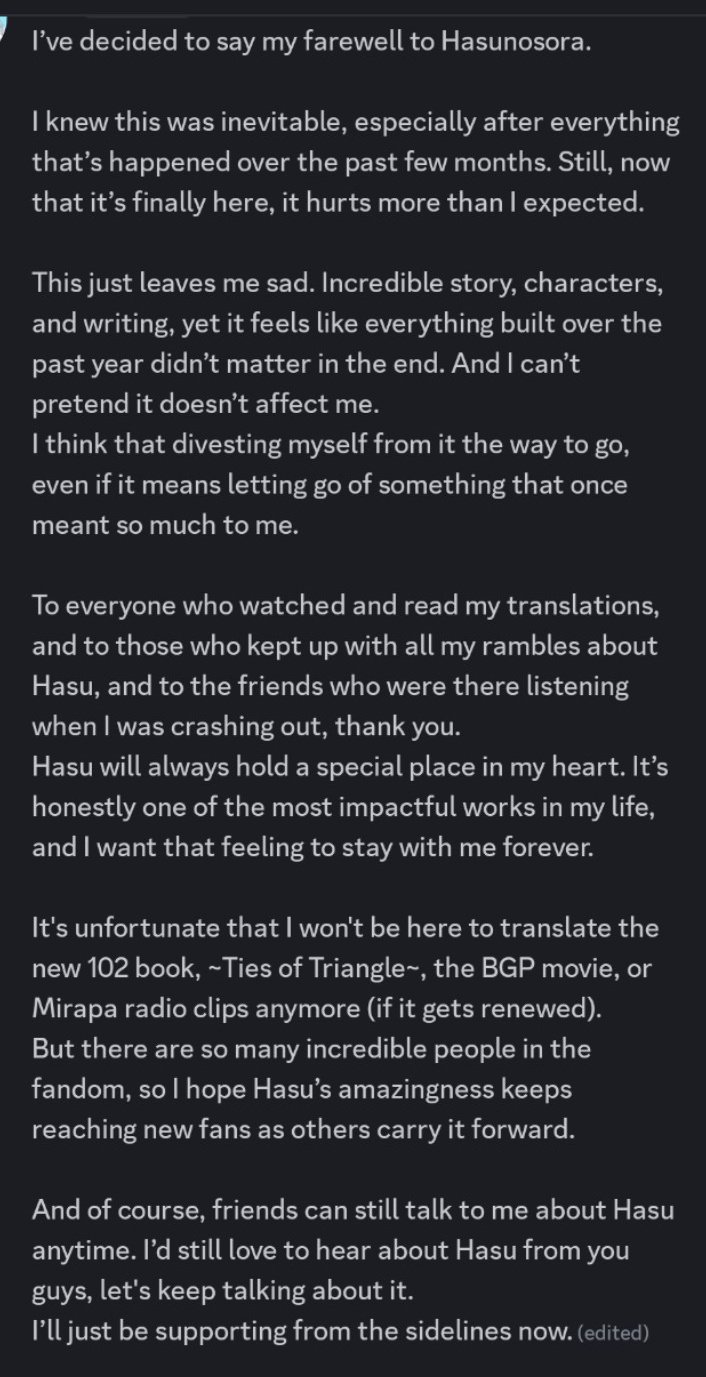 >"Hasu is too long! Too much content"So when was it a bad thing? Is this a new issue with the new gens and lack of attention? I am currently doing gakum@s and I'm 2 years late but I'm thrilled to catch up on music, lives, stories, or whatever else I find. Same shit with muse, I got into them pretty late in there life but going down the rabbit hole with all there things was fun. I enjoyed it at my own pace until I caught up. I didn't experience it in real time but why is that an issue? Is it FOMO of the real time enjoyment? I never understood this argument. If you like something, you just keep enjoying it.